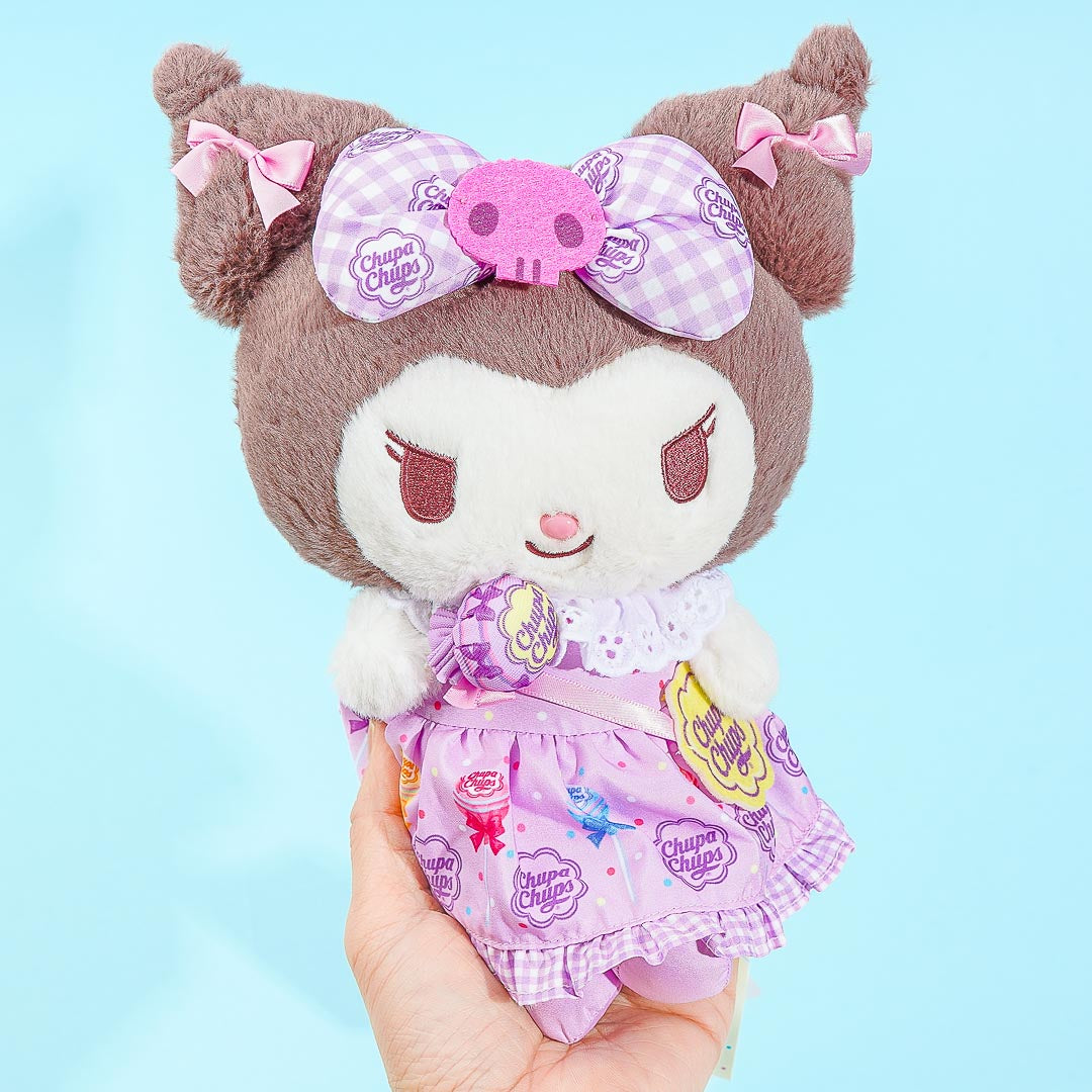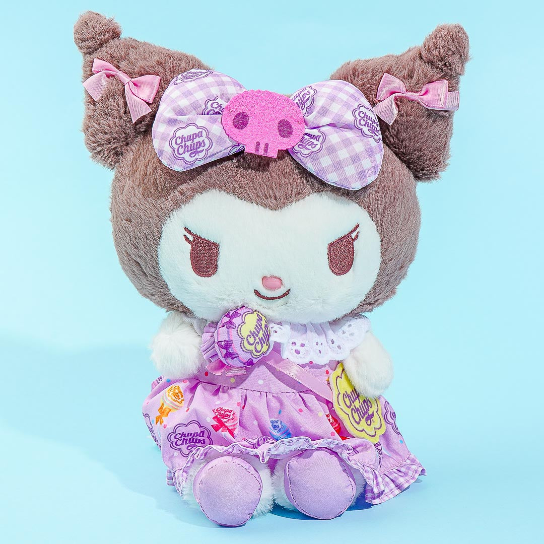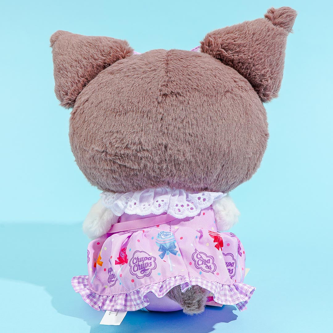 Have fun hugging this super kawaii Kuromi plushie! It comes in medium size and is wearing a fancy dress decorated with illustrations of lollipops and the logo of the popular candy brand, Chupa Chups. You can also place this medium-sized cutie that’s holding a lollipop in your bedroom to add a dose of cuteness!
