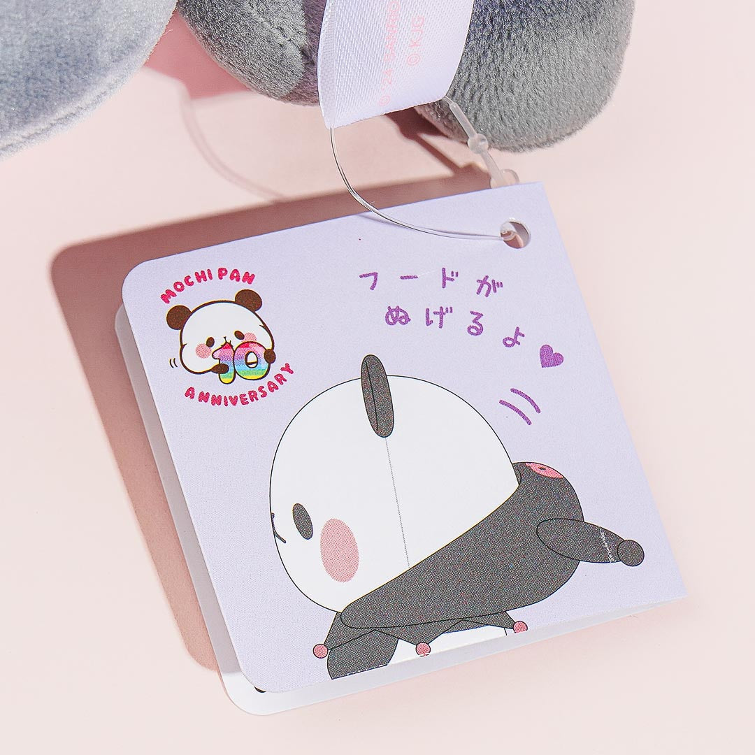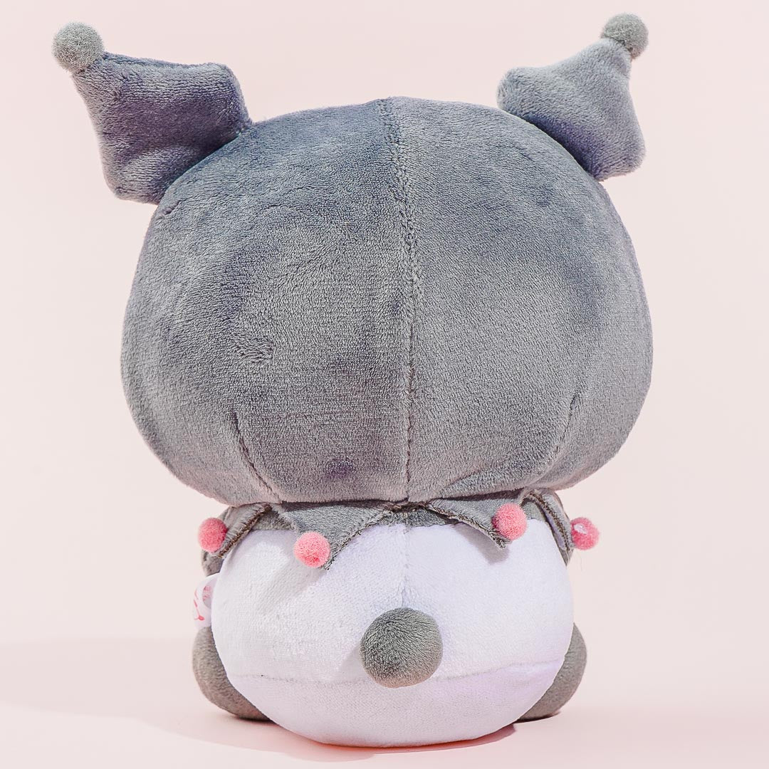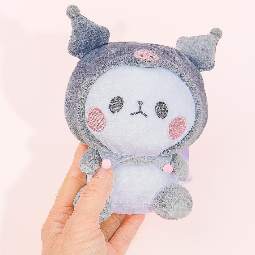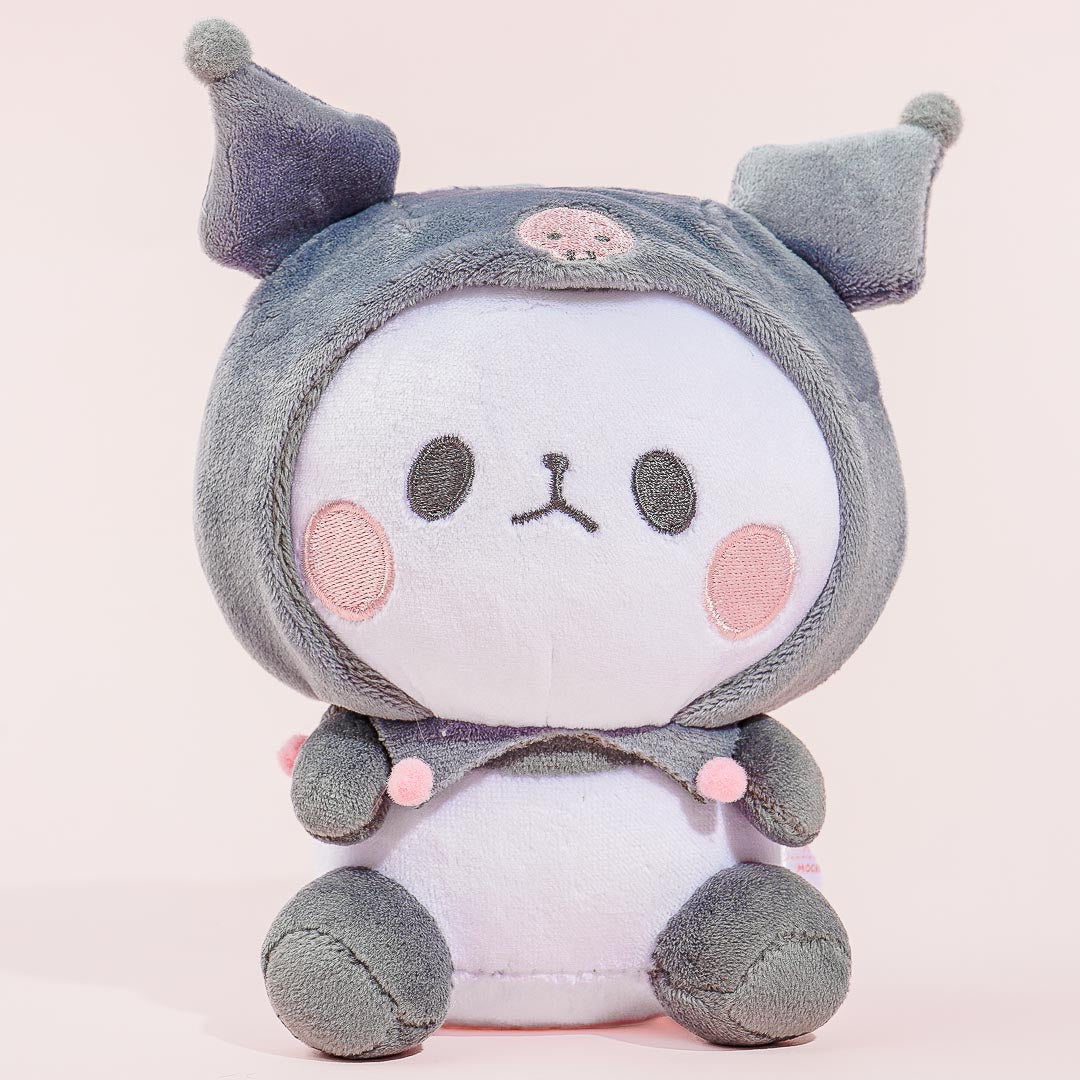This super cute Mochi Mochi Panda plushie is copying Kuromi's style! It's wearing a Kuromi hoodie and is in a sitting position. You can place it on your desk for a touch of kawaii!