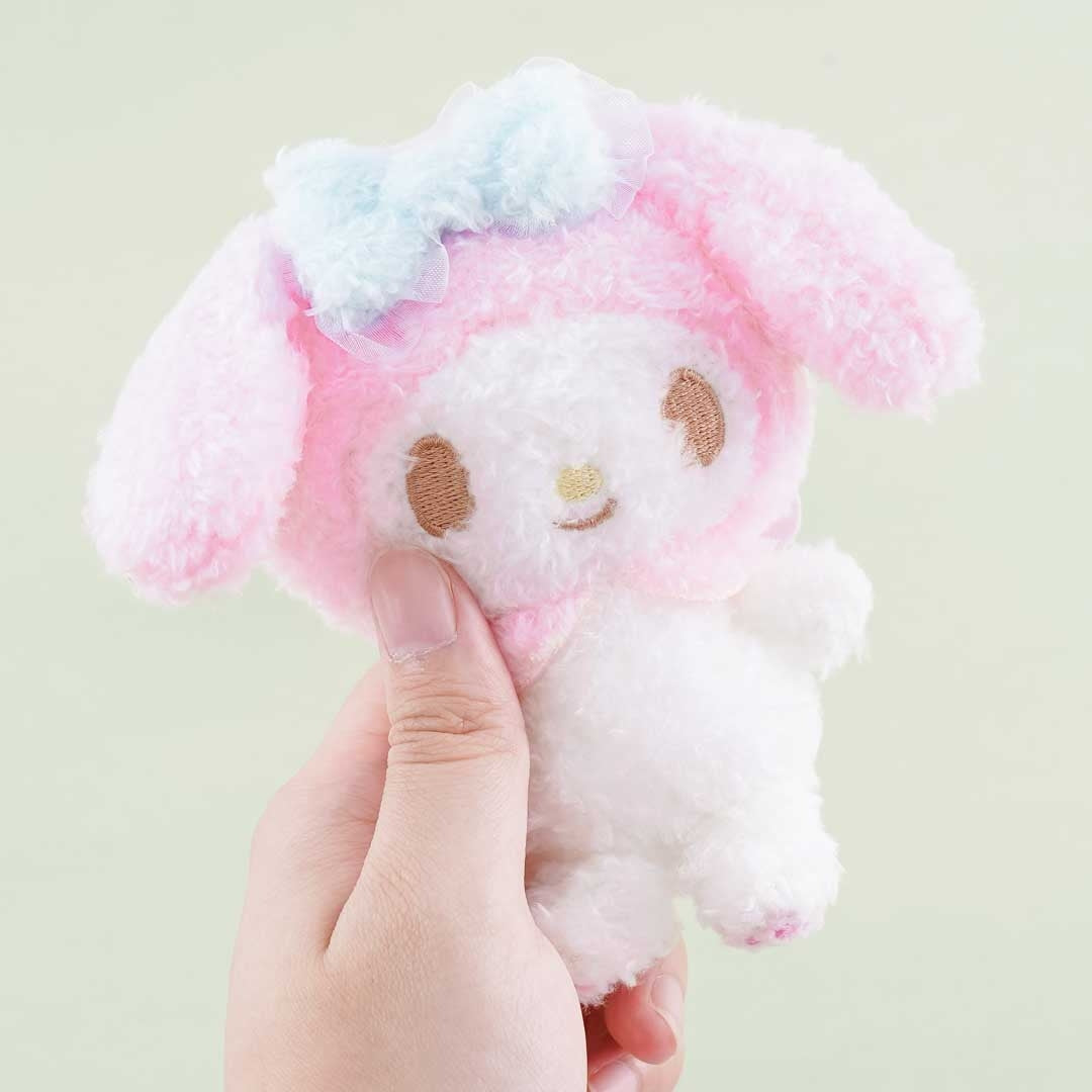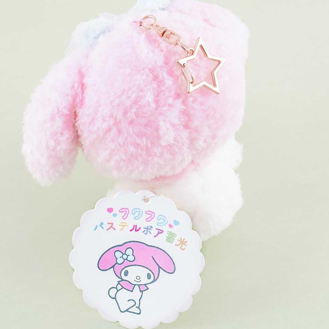 A medium pastel-colored My Melody furry plushie that doubles as a charm
