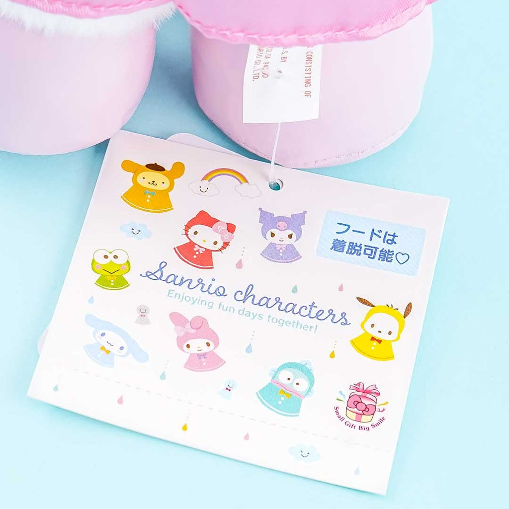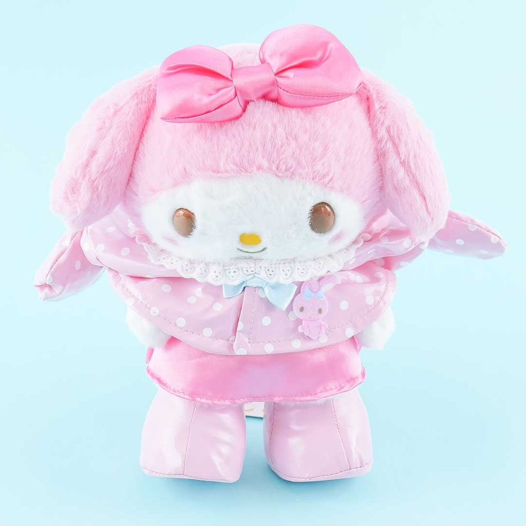 A super kawaii medium-sized My Melody plushie wearing a raincoat with a removable hood