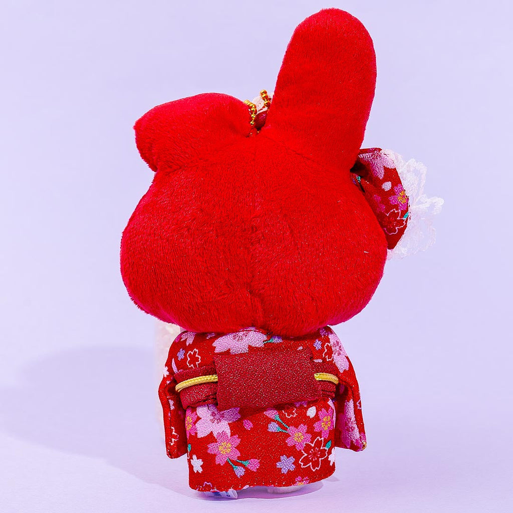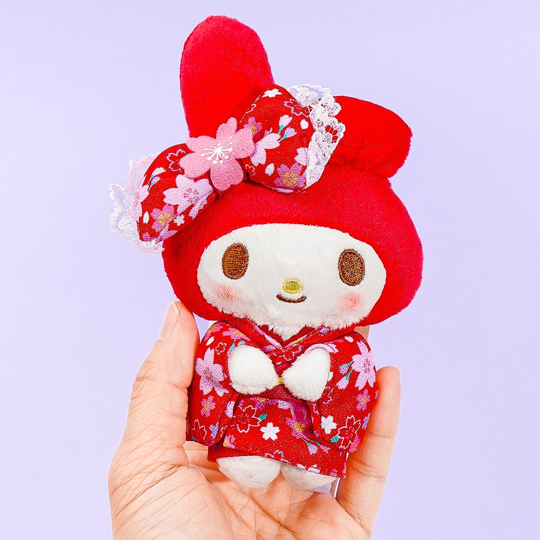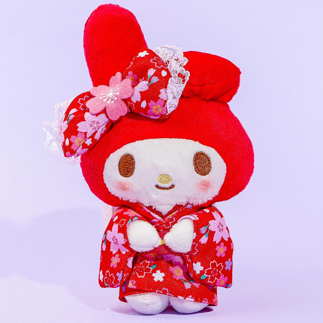This My Melody plushie is wearing a vibrant red kimono decorated with lots of pink cherry blossoms! Bring this medium-sized cutie to your next picnic underneath the sakura trees during the spring.