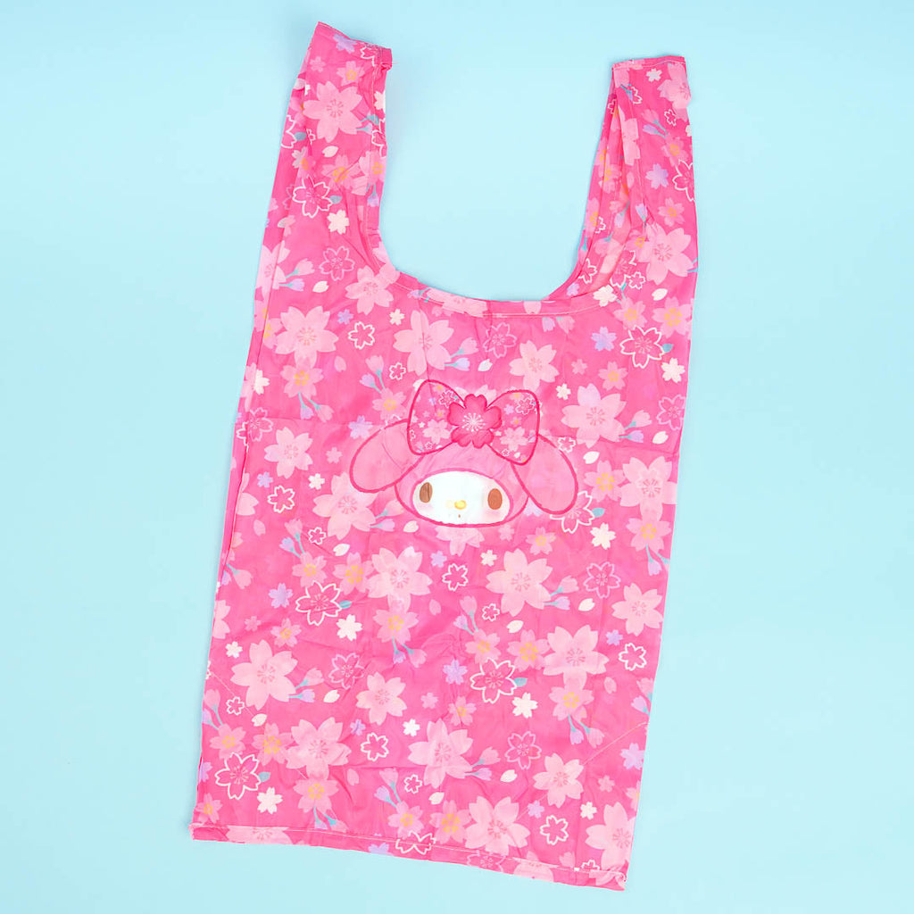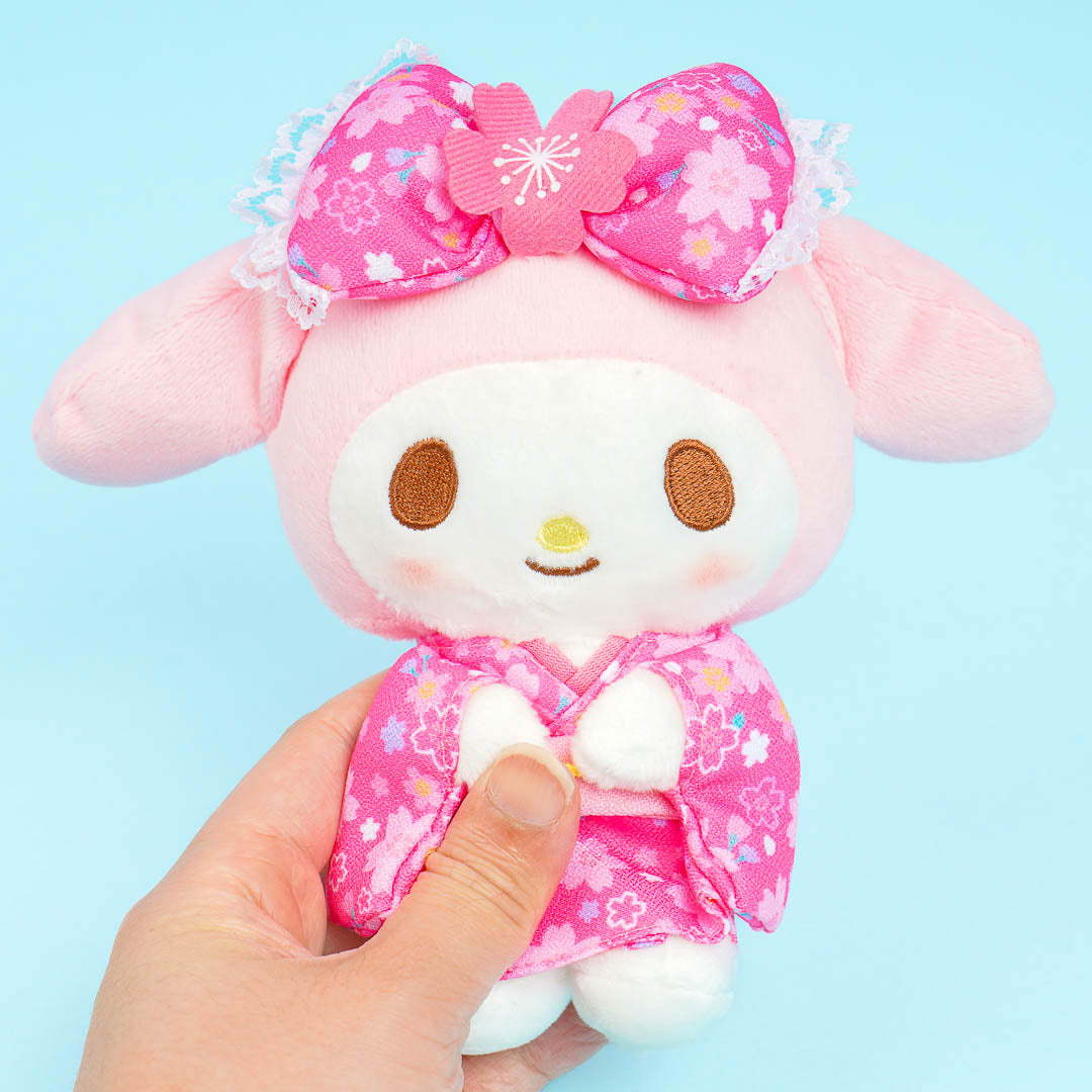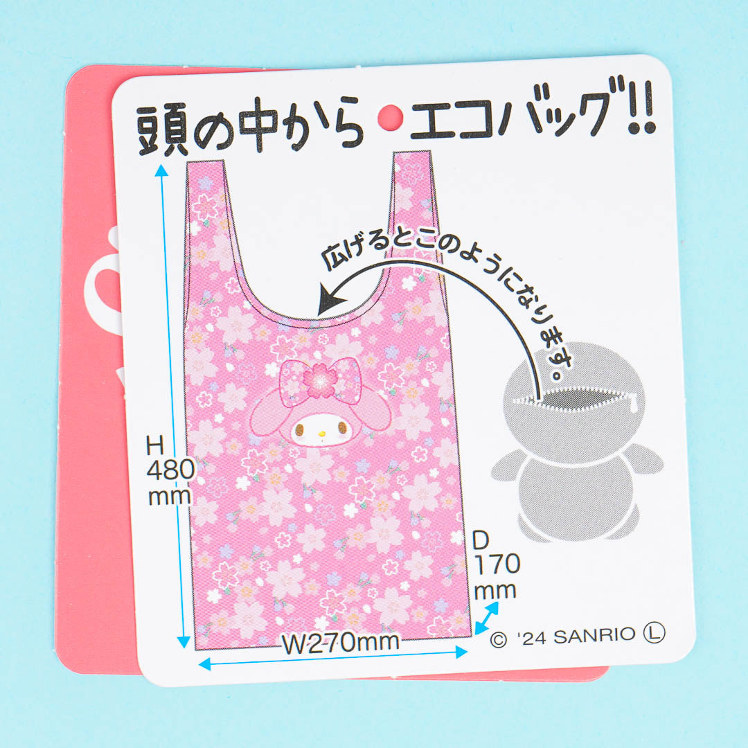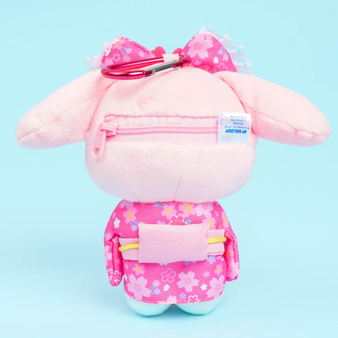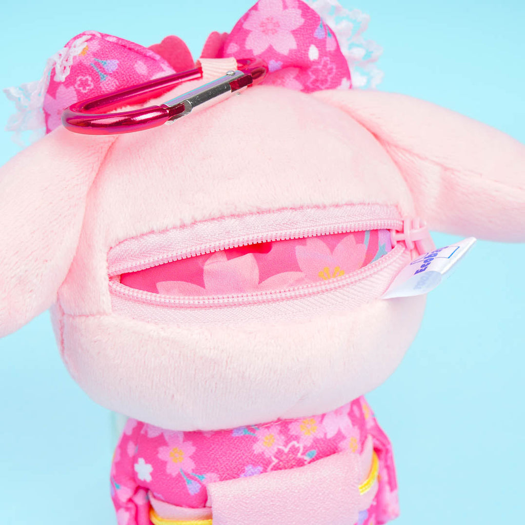 Go window-shopping together with this super kawaii medium-sized My Melody plushie. This cutie dressed in a sakura kimono has a hidden secret! At the back of her head is a zippered compartment containing a tote bag covered in prints of My Melody and sakura flowers.