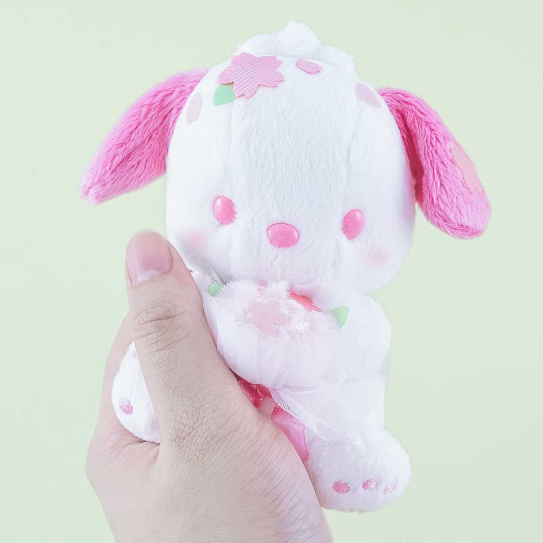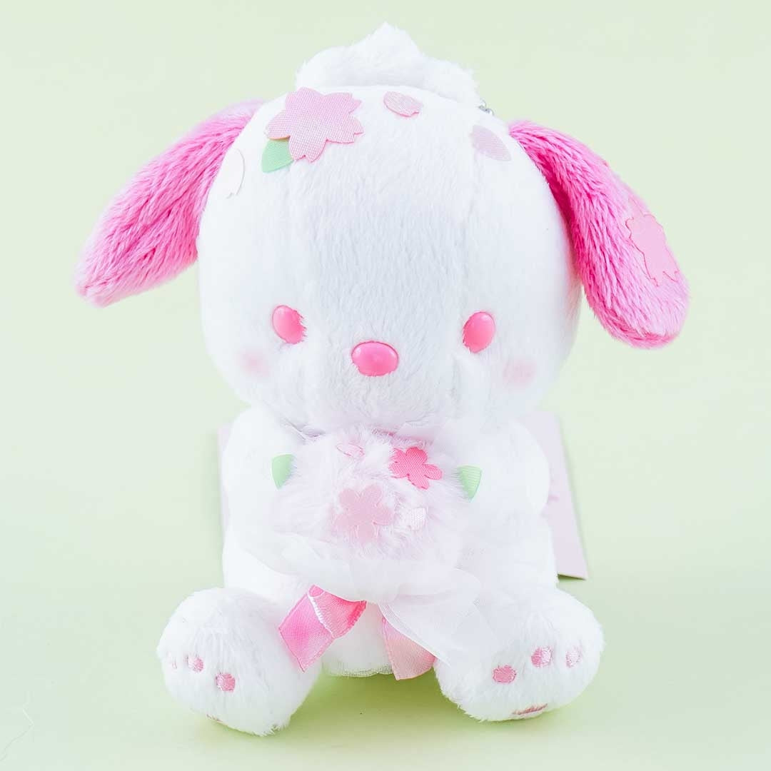 A kawaii medium-sized Pochacco plushie wearing sakura accessories while carrying a bouquet