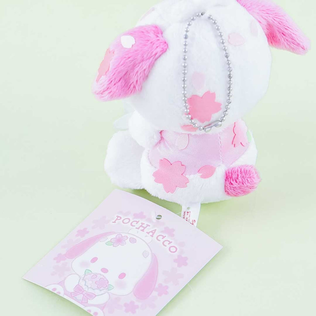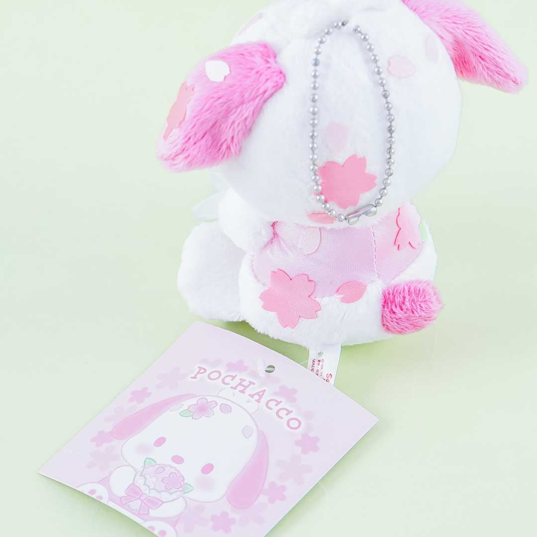 This cute Pochacco plushie is wearing sakura accessories! It's also carrying a bouquet of flowers in its hands. You can attach this medium-sized plushie to your favorite bag with its removable ball chain.