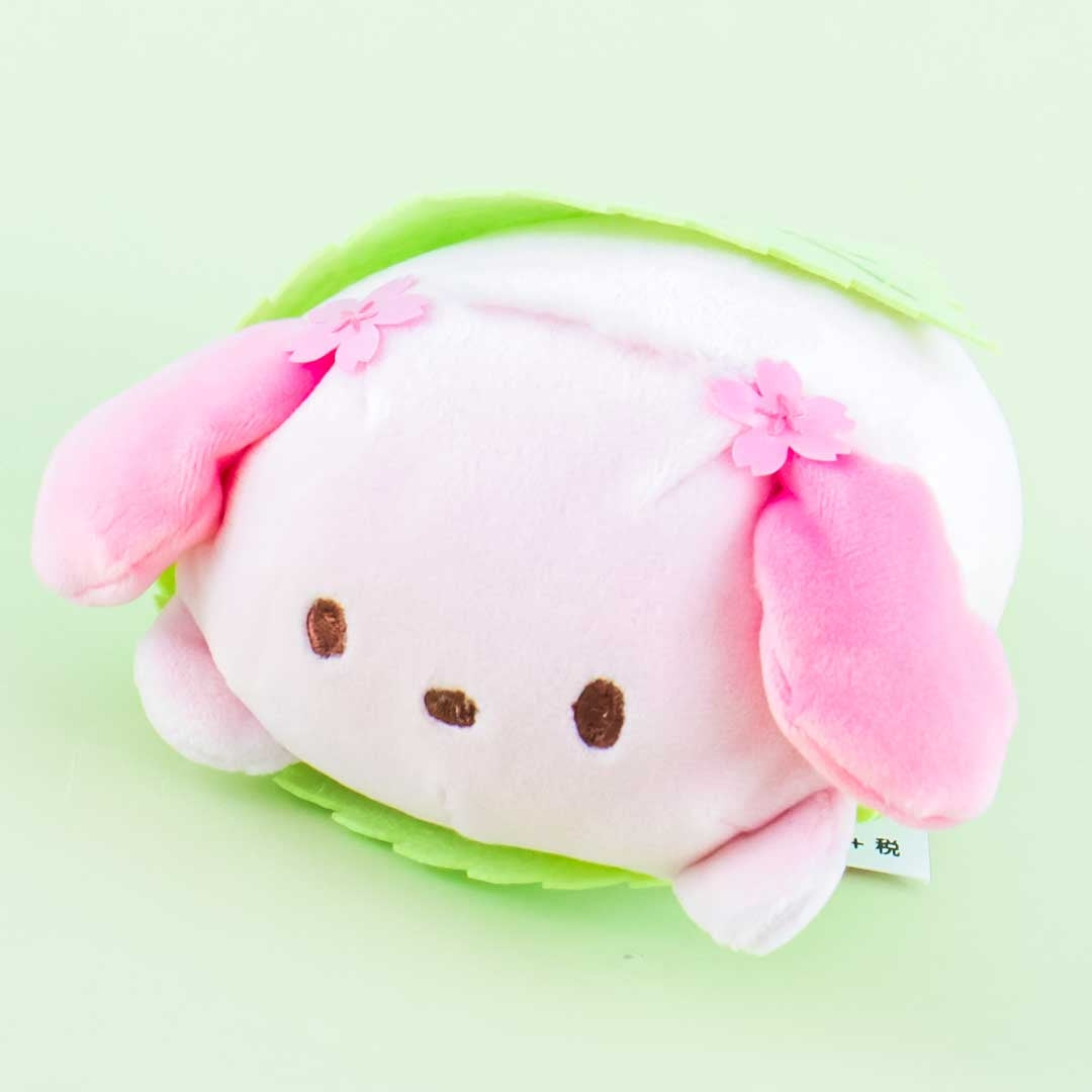 Have tea time together with this super kawaii Pochacco plushie shaped like a ball of mochi or Japanese rice cake! This medium-sized sweetie has pink sakura flowers on its ears. It also has a cute leaf wrapped around its round rice ball-shaped body!