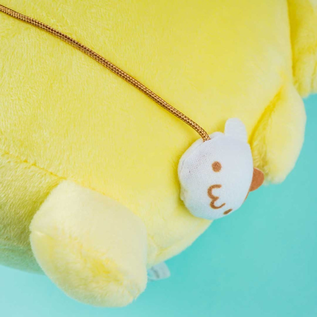 • A fluffy blushing Pompompurin plushie that can sit down on its butt