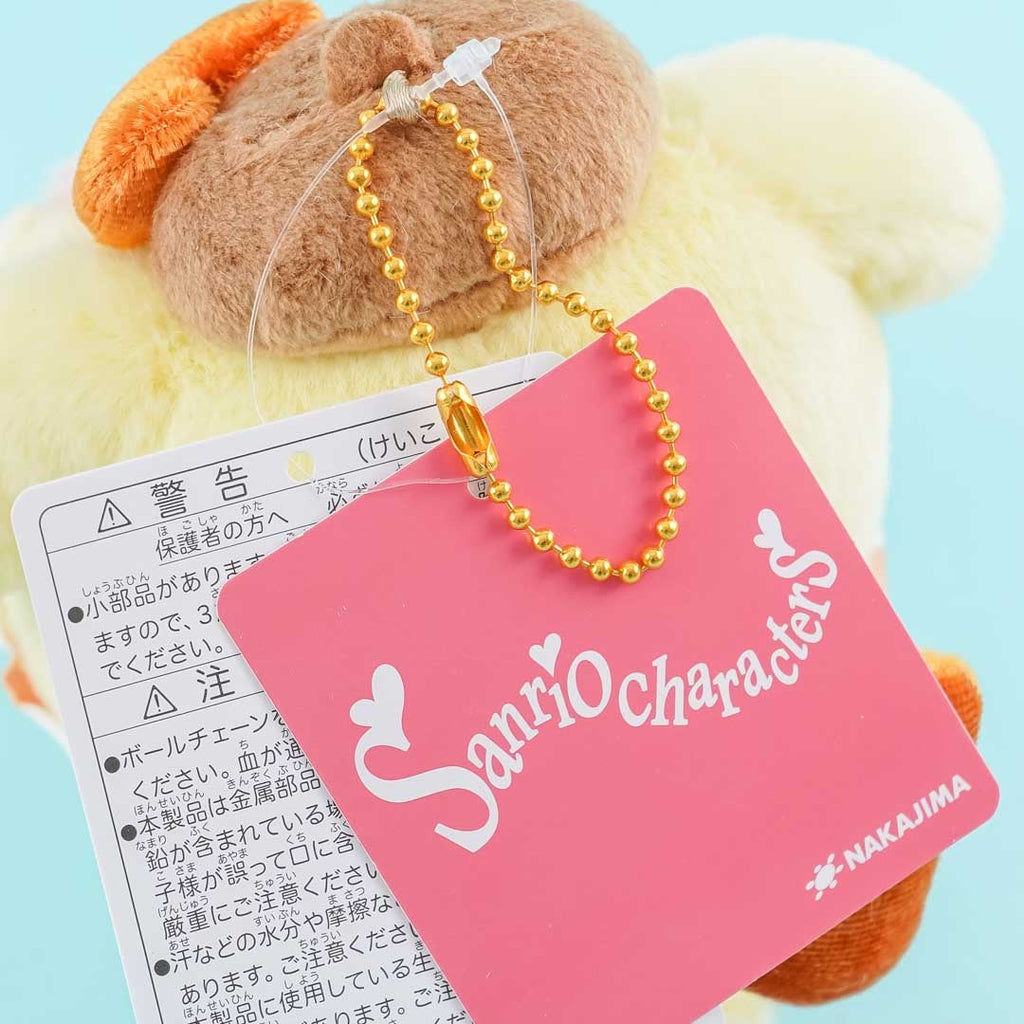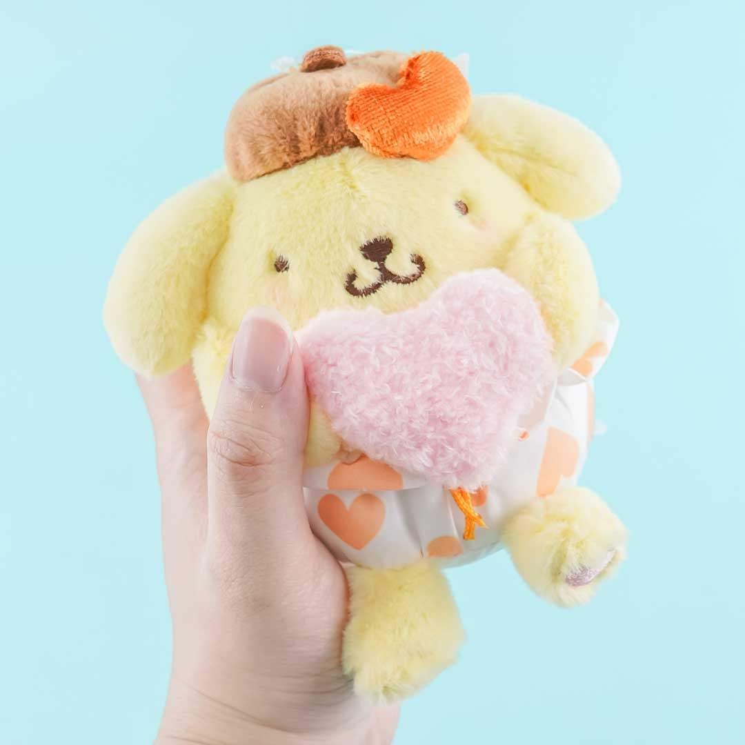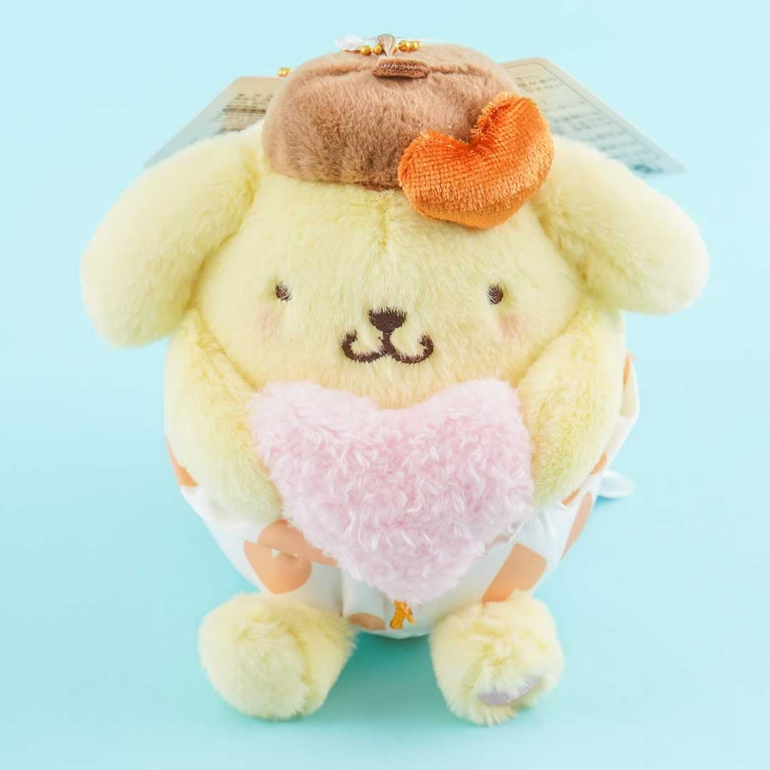 Sleep soundly beside this fluffy Pompompurin plushie wearing pants with heart prints! This medium-sized cutie is made of polyester and is hugging a heart as well. You can also hang this on your backpack by attaching this through its removable ball chain.