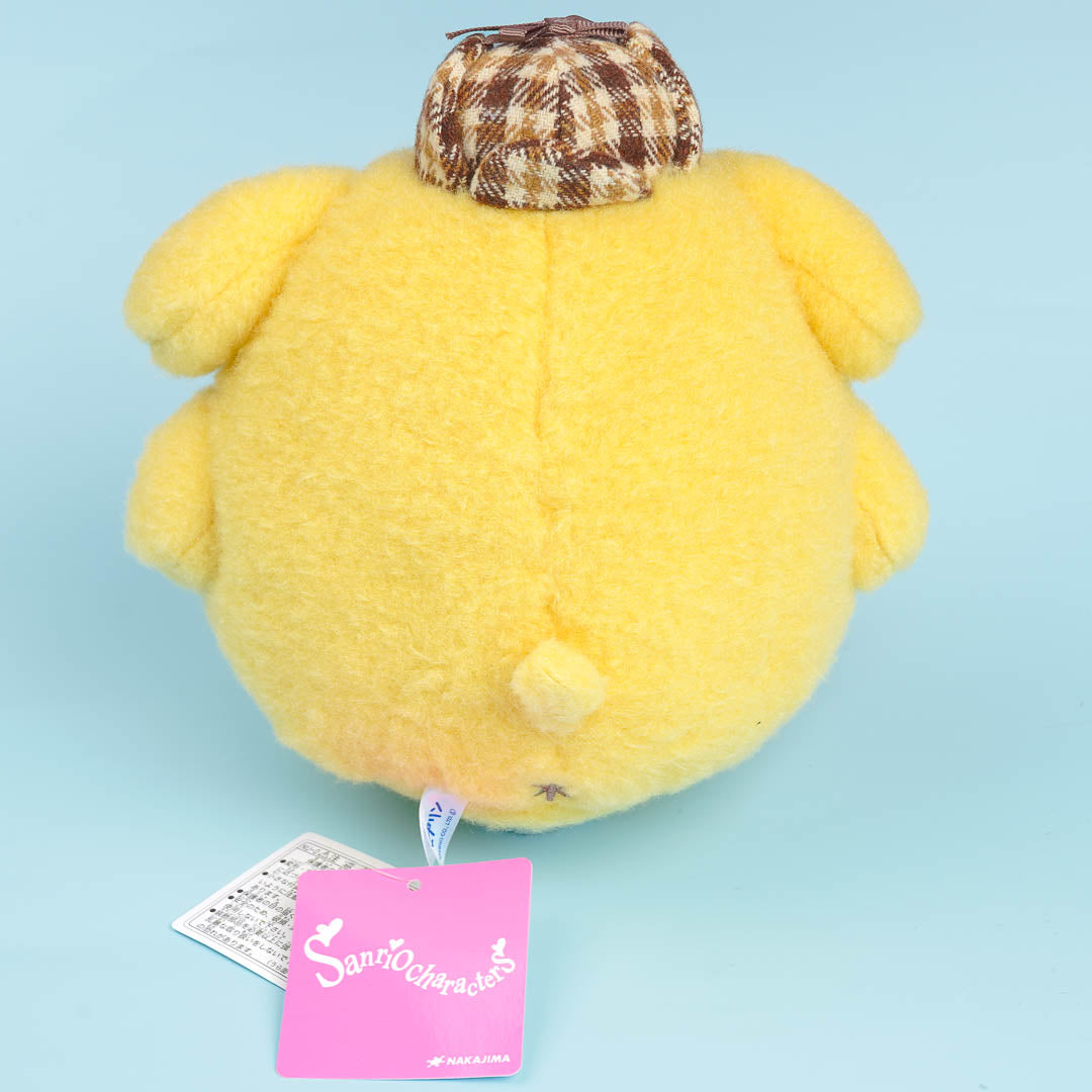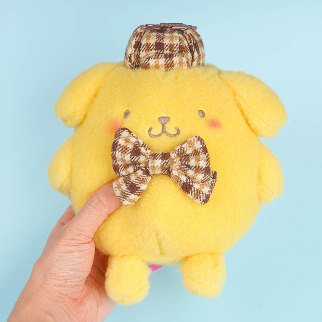 Take naps together with this super cute Pompompurin plushie! It's wearing a mocha-colored bow and hat with a cute checkered pattern. This medium-sized stuffed toy is made from soft and fluffy fabric.