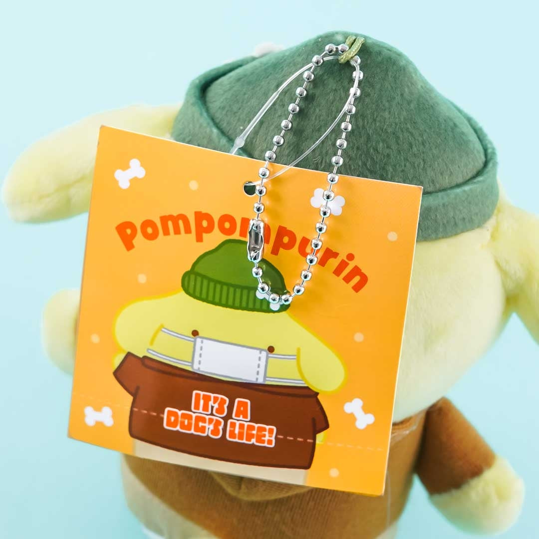 This Pompompurin plushie is perfect for your kawaii collection. It comes in medium size and is wearing a mask that you can pull down. Pompompurin is also wearing a bonnet hat and a shirt that says, "It's a dog's life!" Easily hang this cutie on your favorite bag using its ball chain.