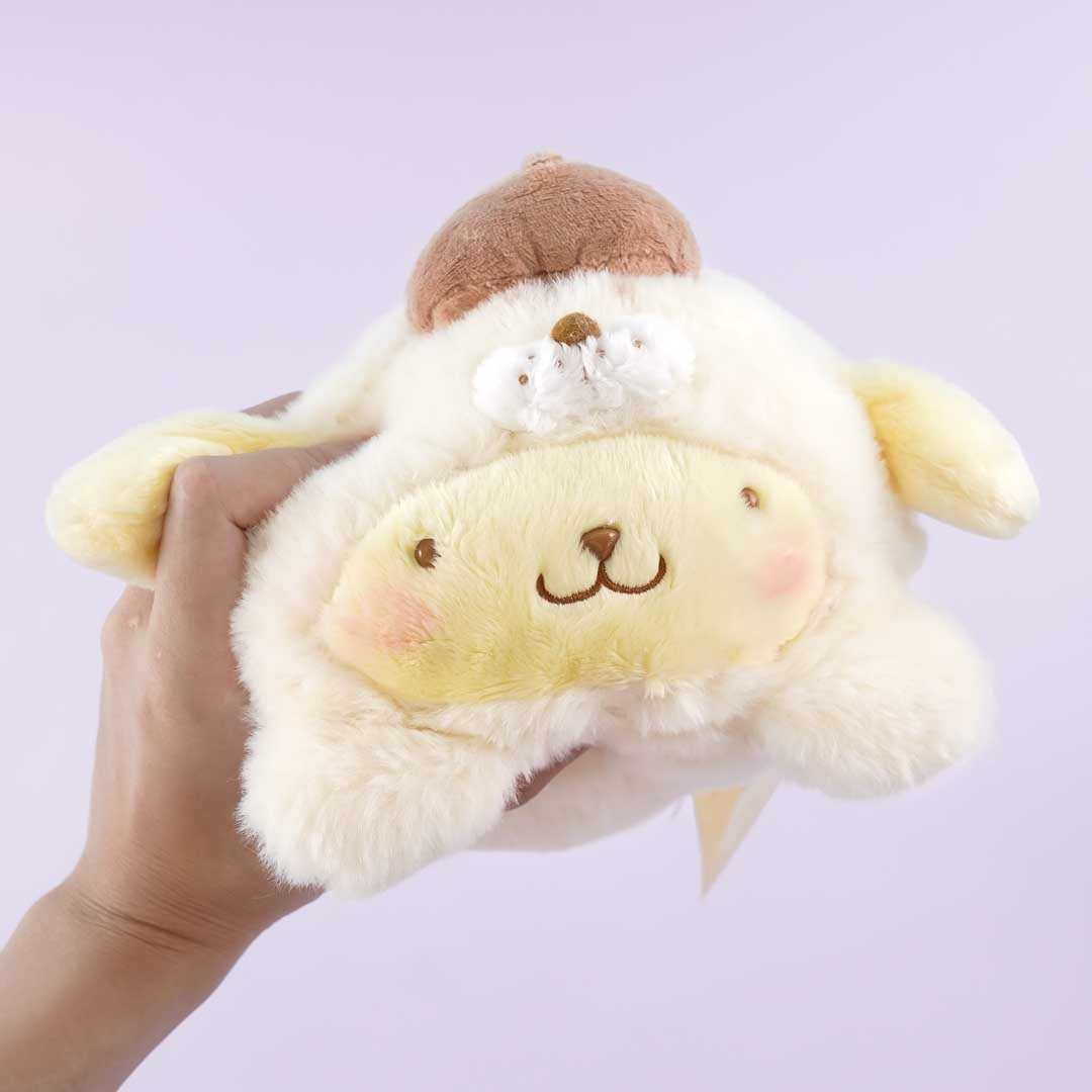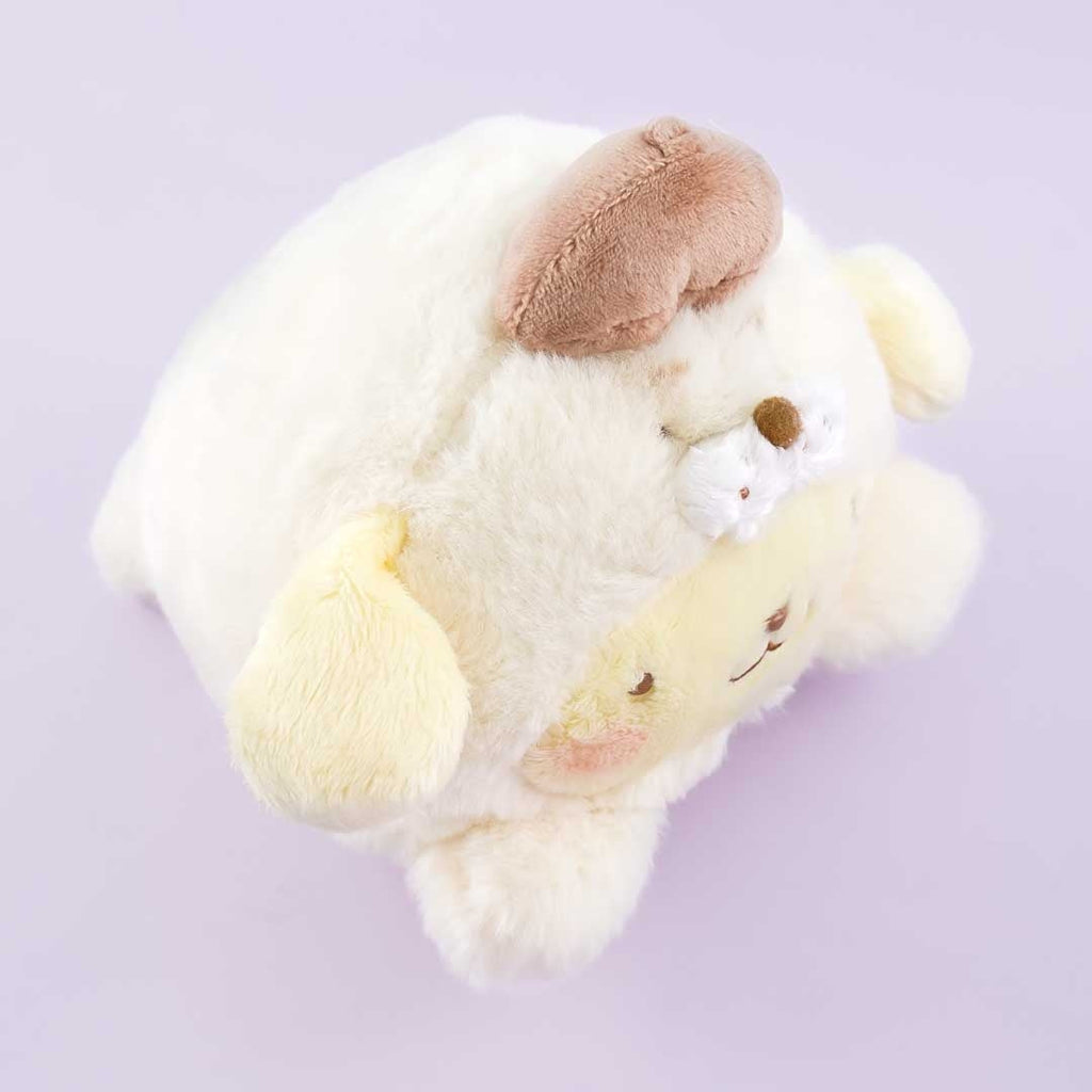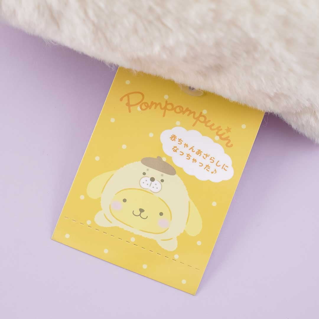 Take this kawaii Pompompurin plushie as your pal on your next weekend trip! This medium-size fluffy companion is wearing a onesie seal costume and is made of soft polyester material.