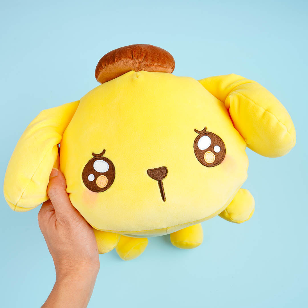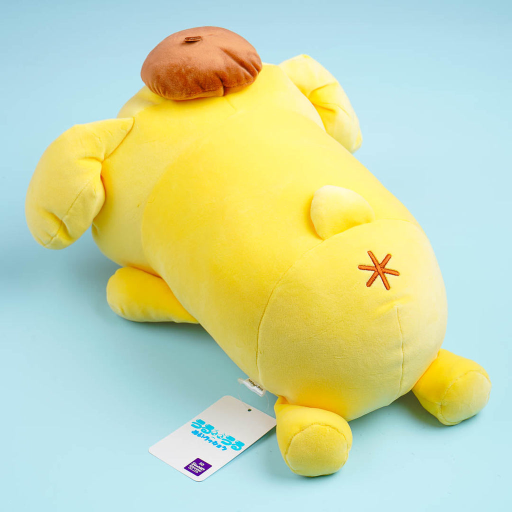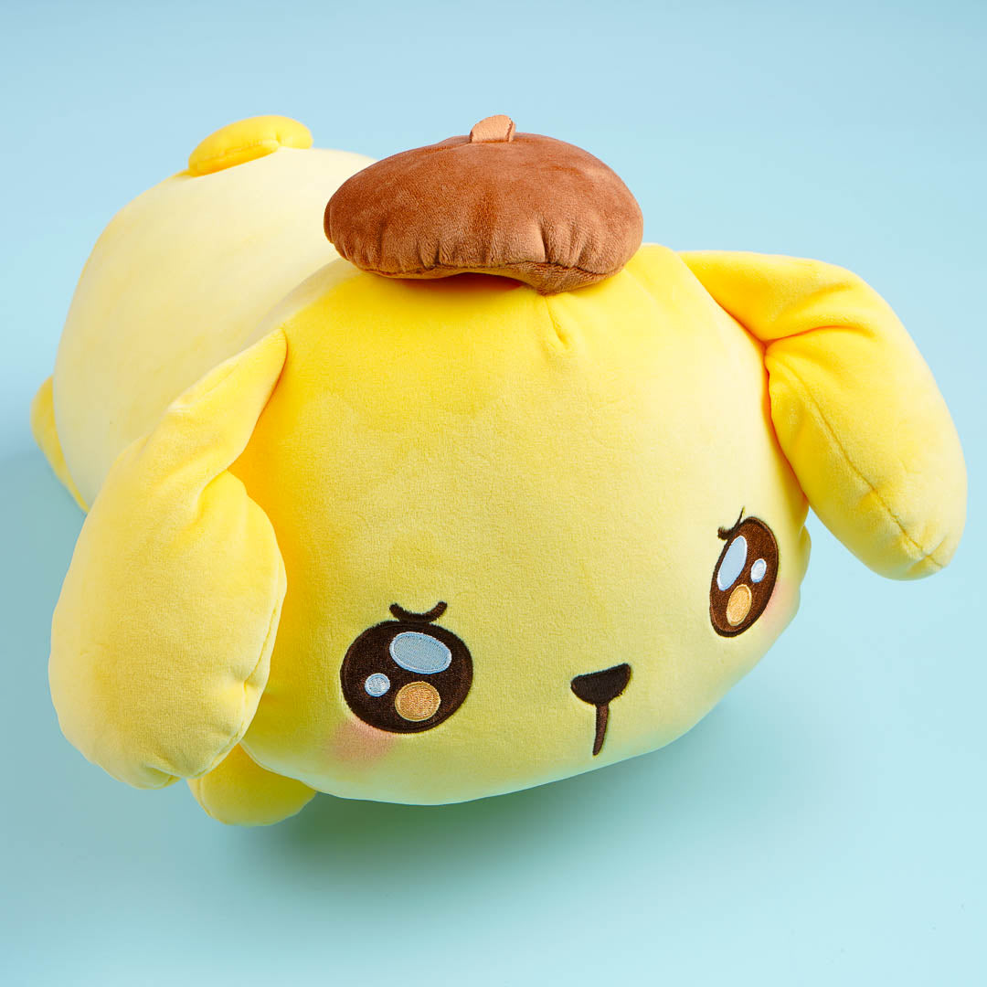 Take this Pompompurin plushie to your next pajama party! It features Pompompurin's teary eyes that are super cute to look at. This medium-sized plushie has a long and squishy body so it can be used as a cushion.