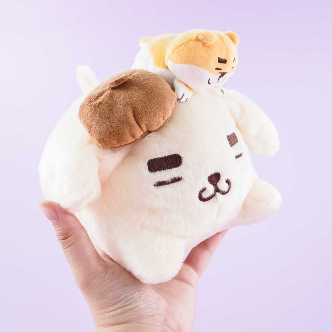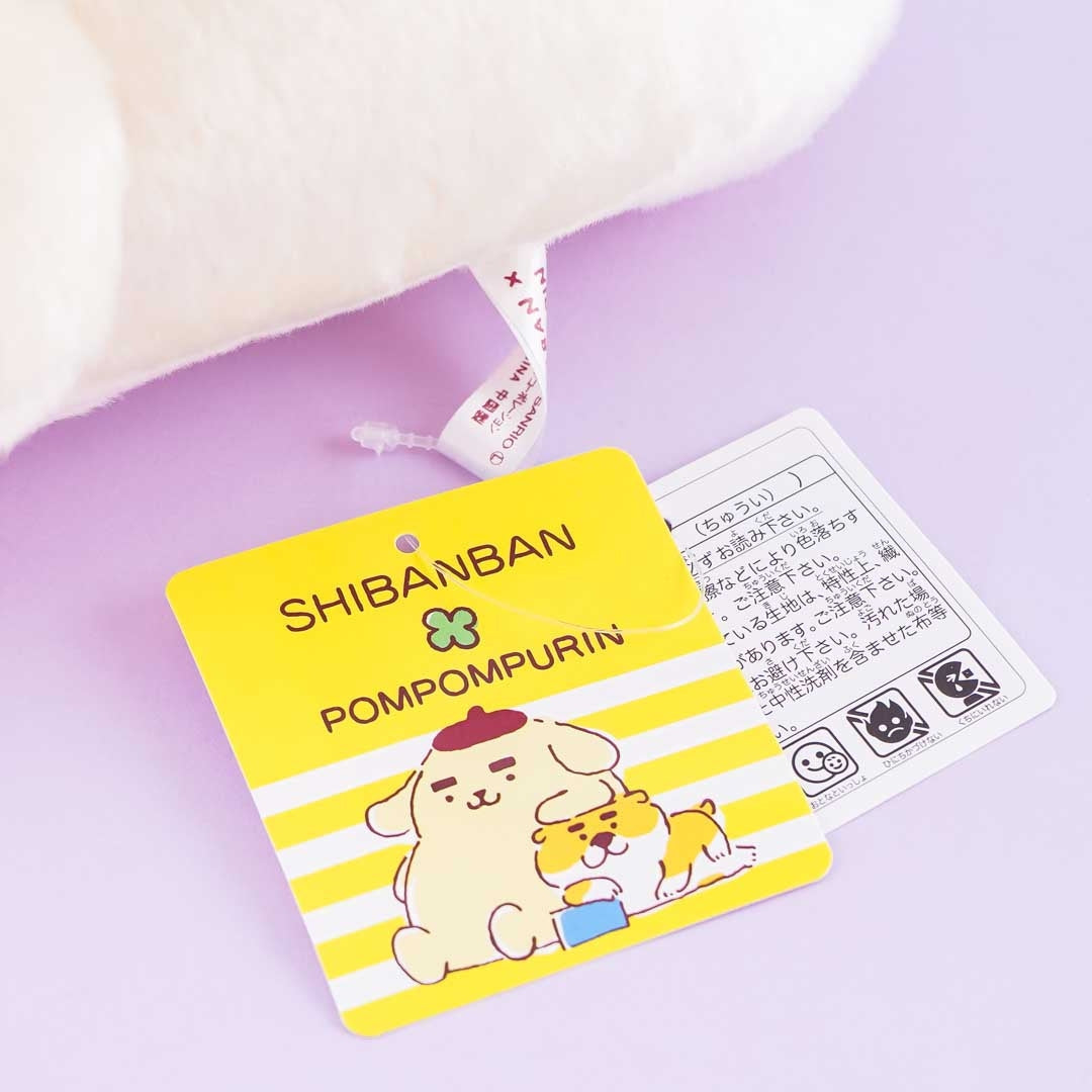 Sleep soundly beside this fluffy sleeping Pompompurin plushie! This medium-sized cutie is made of polyester and comes with a tiny napping Shibanban the Shiba Inu plushie attached to its head.