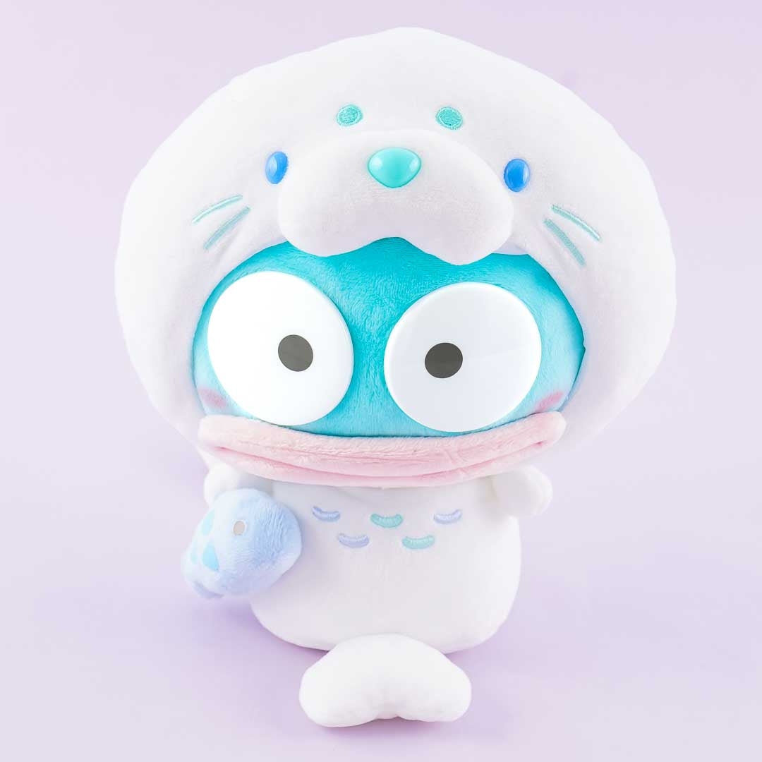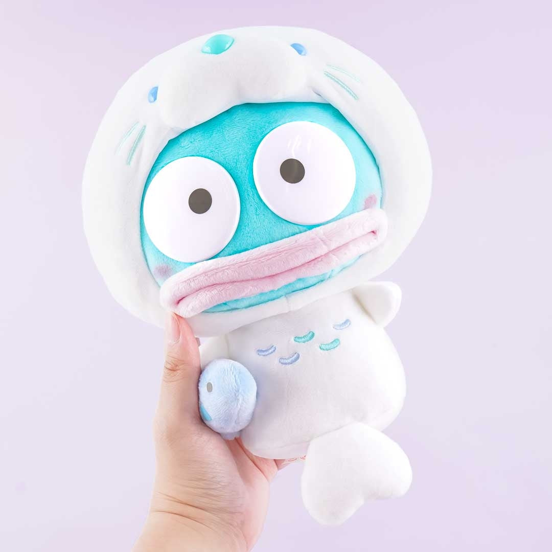 Play together with this super kawaii Hangyodon plushie wearing a seal costume! It comes from the Sanrio Ice Friends plushie series. You can take off the hood of this medium-sized cutie.