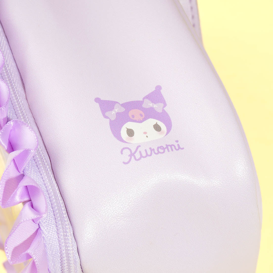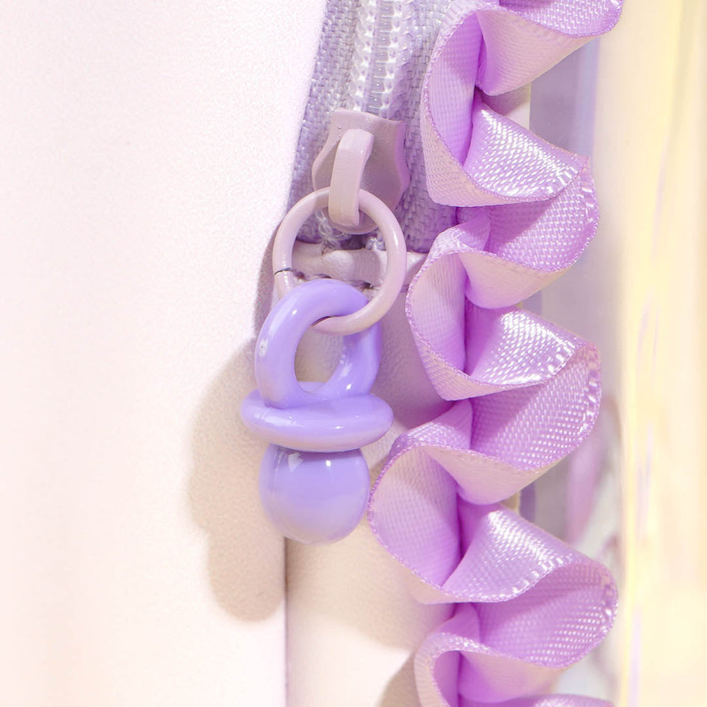 This ruffled handbag is the perfect place to keep your Kuromi Enjoy Idol Baby plushie! It looks like a baby cradle with its box shape and clear zippered front. The bag features a pacifier-shaped zipper, a baby bottle plush charm, and a mini pocket. You can even attach this bag to your backpack using the hook on the bag's handle!