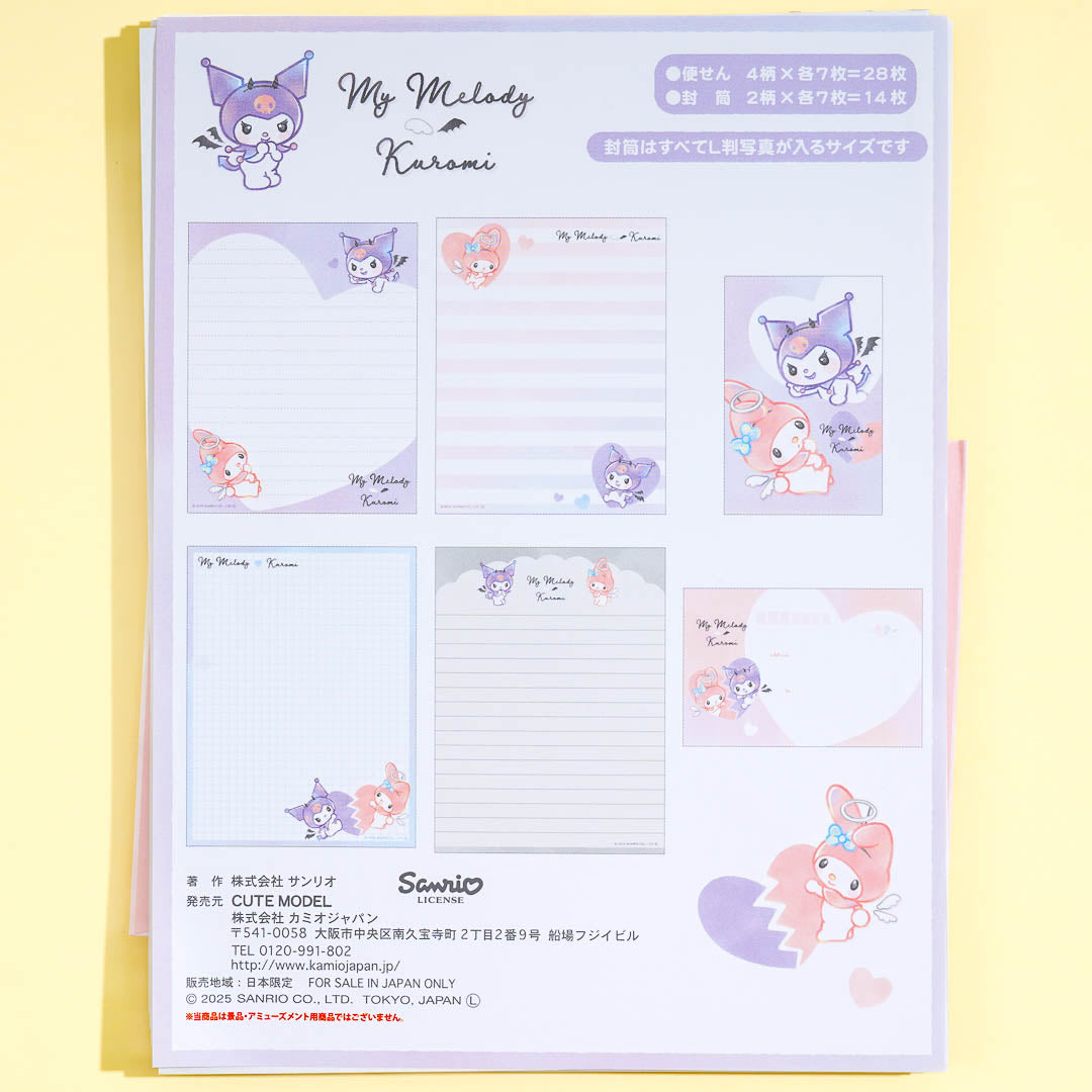 This super cute letter set features prints of My Melody and Kuromi! My Melody is dressed as an angel, and Kuromi is dressed as a devil, showing their cute rivalry. This kit has four different letter sheet patterns and two envelope designs. Add this set to your kawaii stationery collection!
