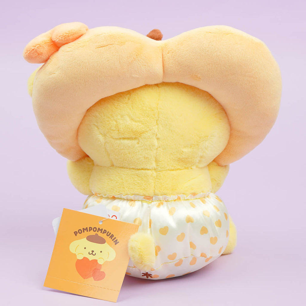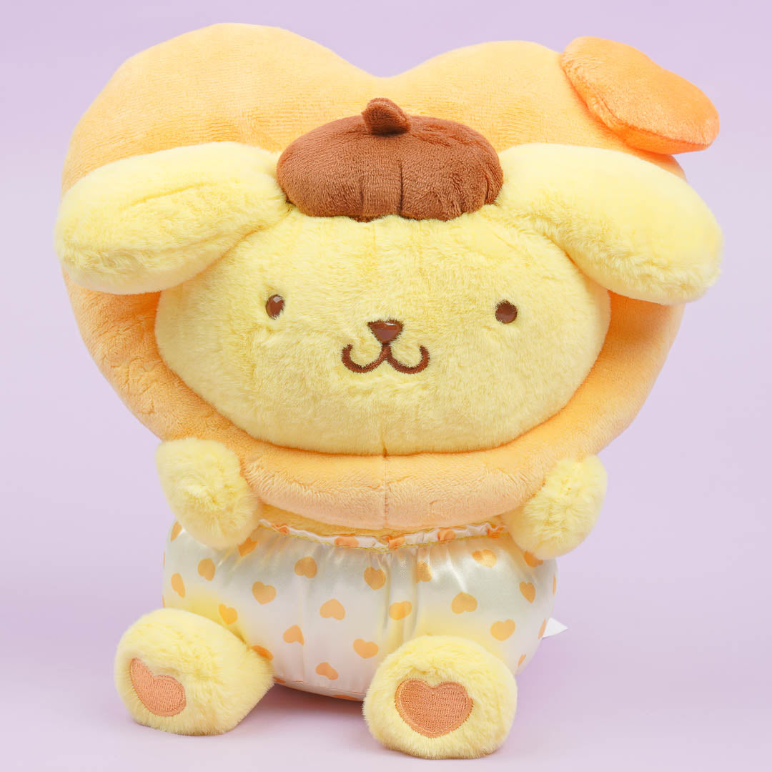 This medium-sized Pompompurin plushie is wearing a unique heart-shaped headdress! Have fun playing with this fluffy cutie and take it with you on your next adventures.