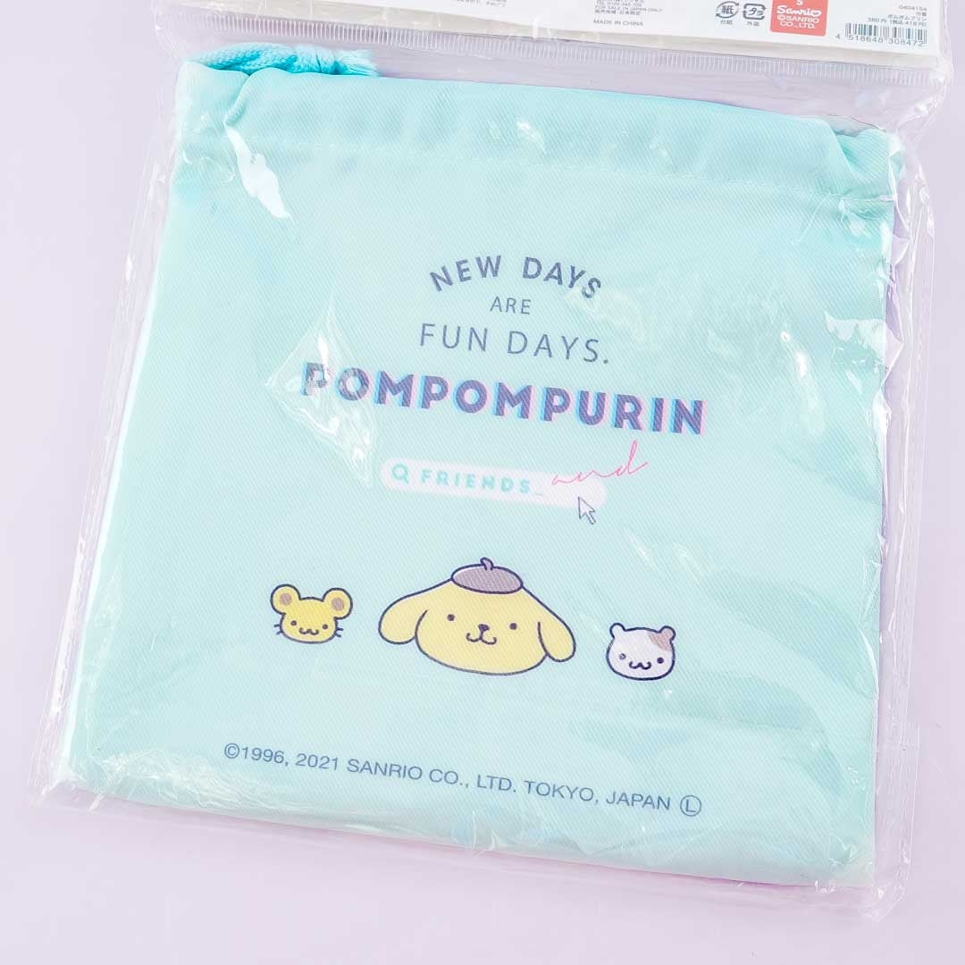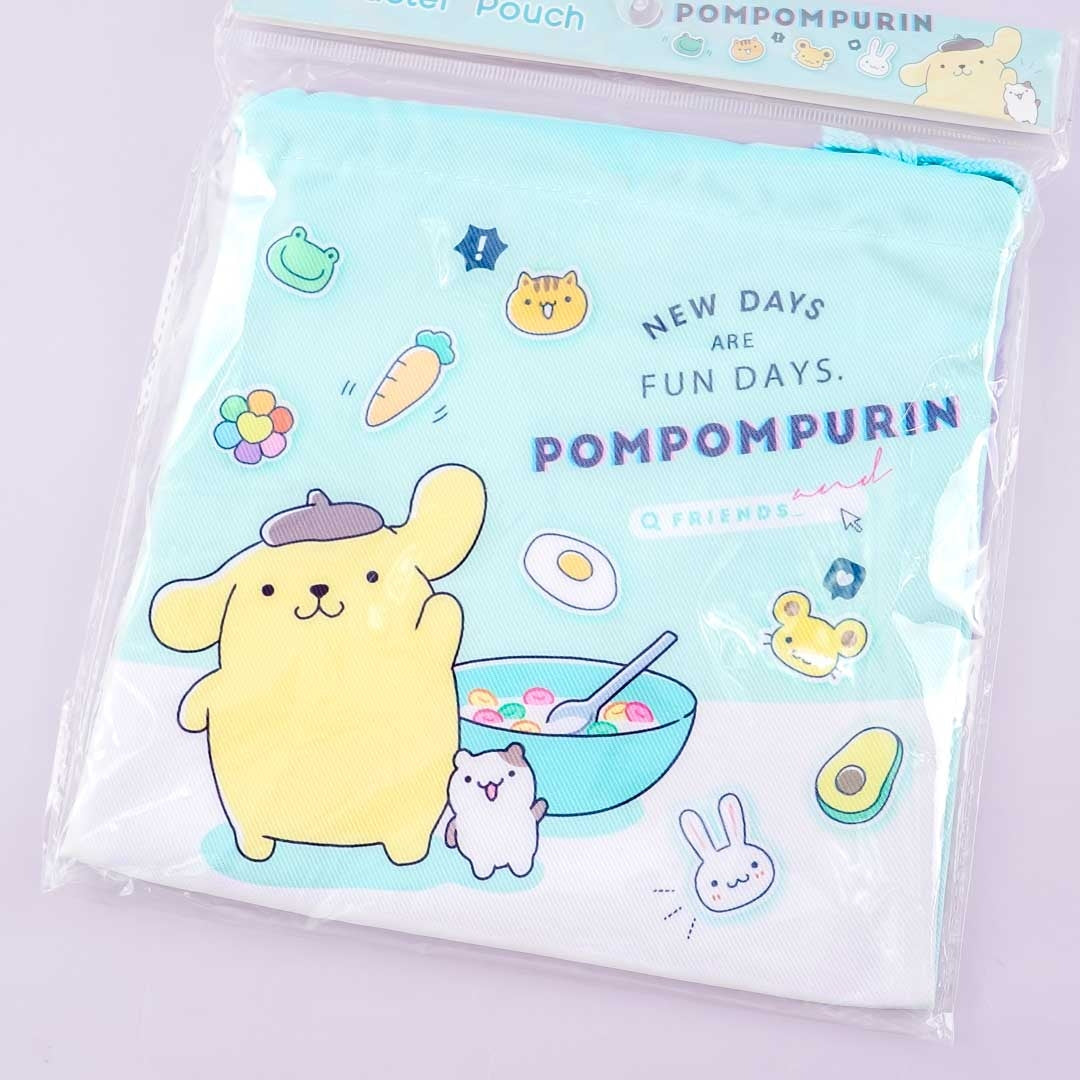 • A drawstring pouch with cute illustrations of Pompompurin, Muffin, and a huge cereal bowl