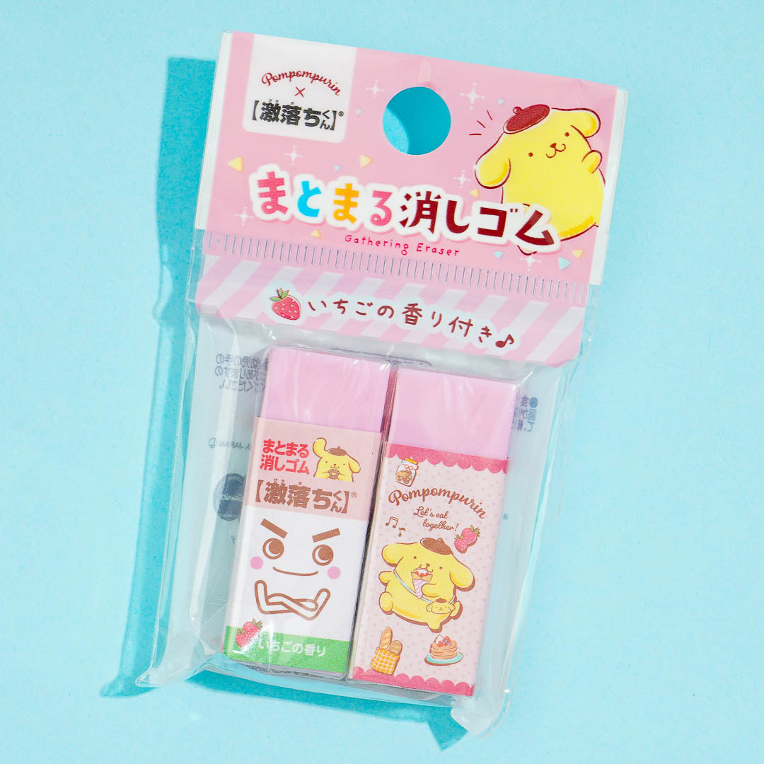 Erase your writing mistakes while enjoying the nice smell of strawberries! This rubber eraser set features prints of Pompompurin and Gekiochi-kun, a popular image character for a cleaning sponge in Japan.