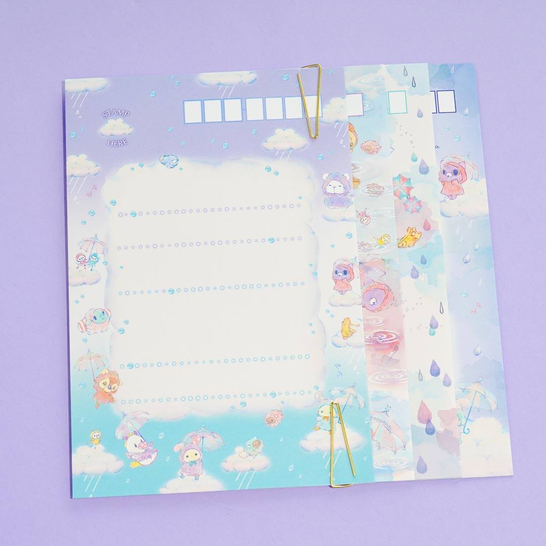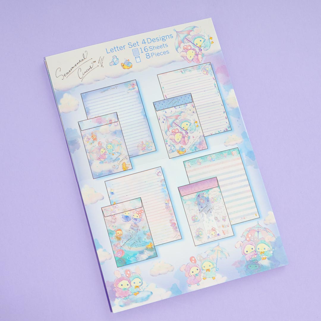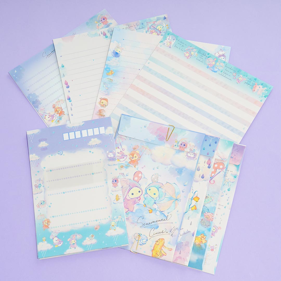 Send heartfelt messages to your friends and family using this kawaii letter set! Its illustrated sheets and envelopes feature the cute Sentimental Circus characters surrounded by tear-shaped raindrops.