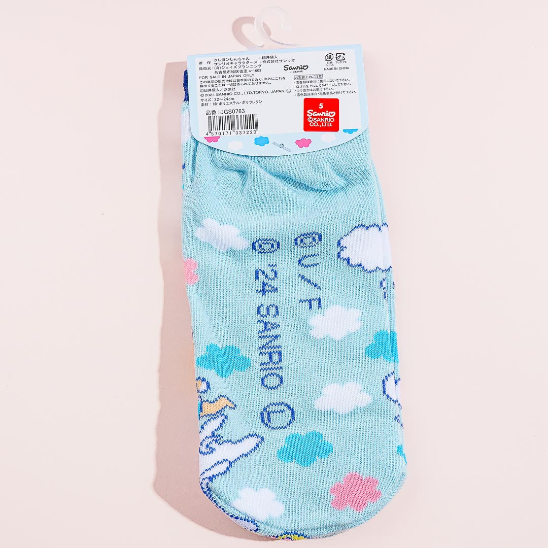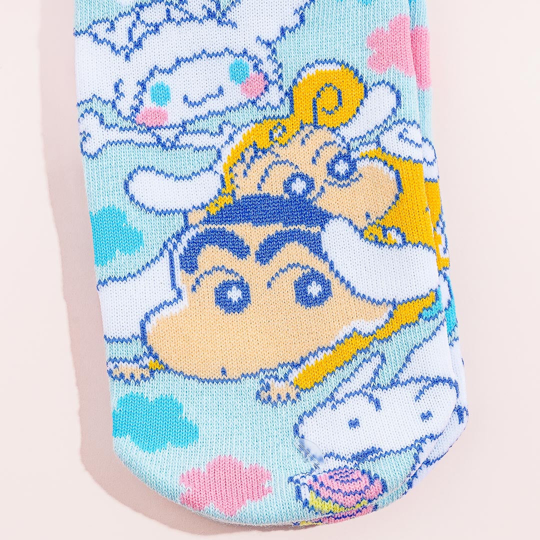 This super kawaii pair of socks is illustrated with Shin-Chan and his friends flying in the sky with Cinnnamoroll! It comes from a collab between Crayon Shin-Chan and Sanrio. Wear these socks when you head out to the park.