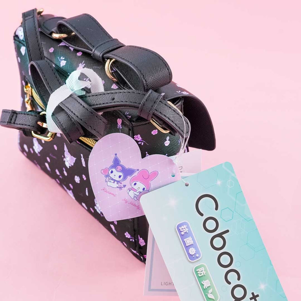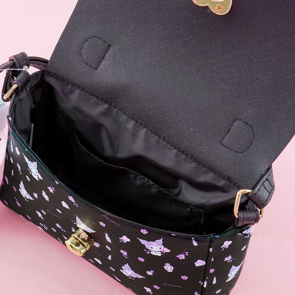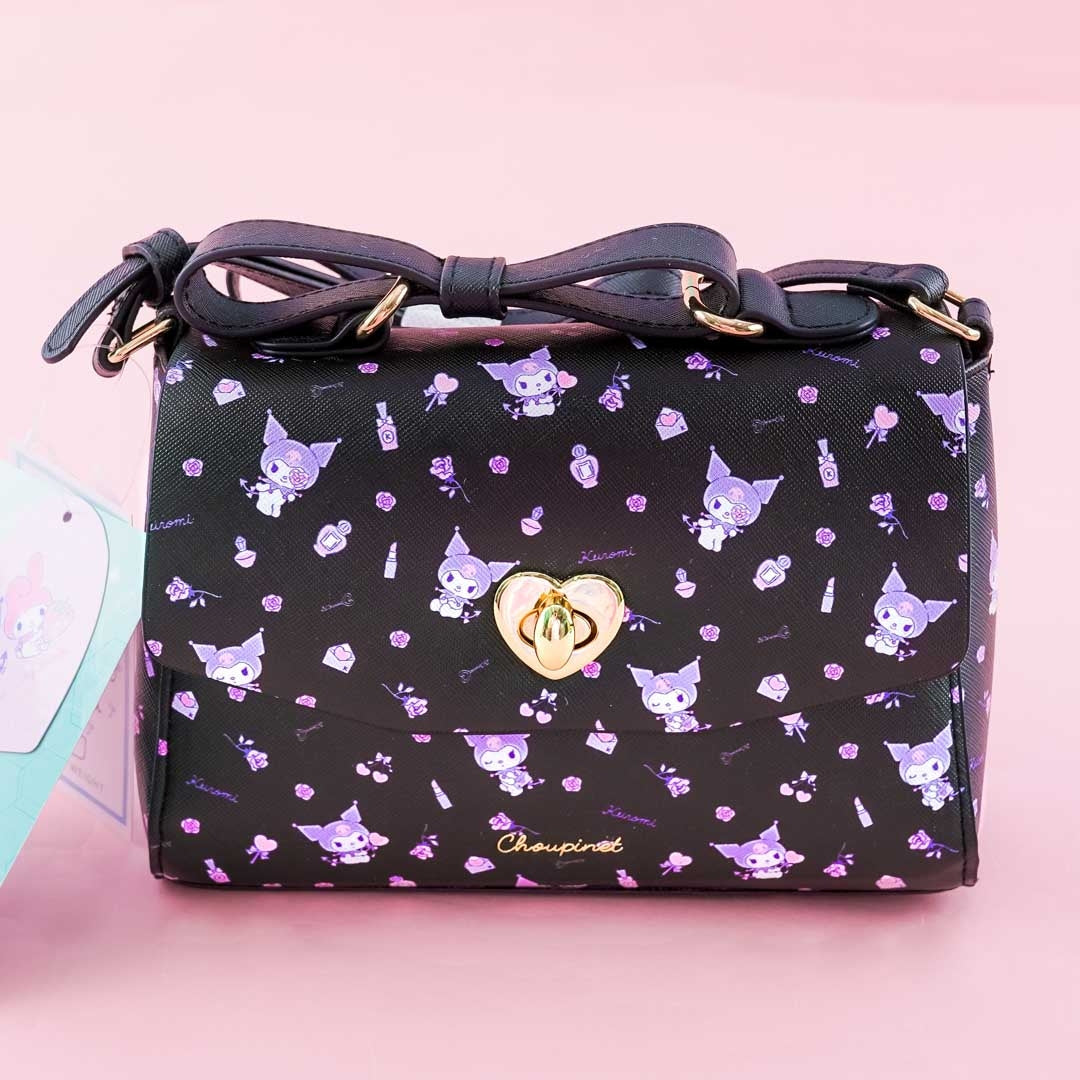 • A kawaii black-colored shoulder bag featuring illustrations of Kuromi with her favorite objects