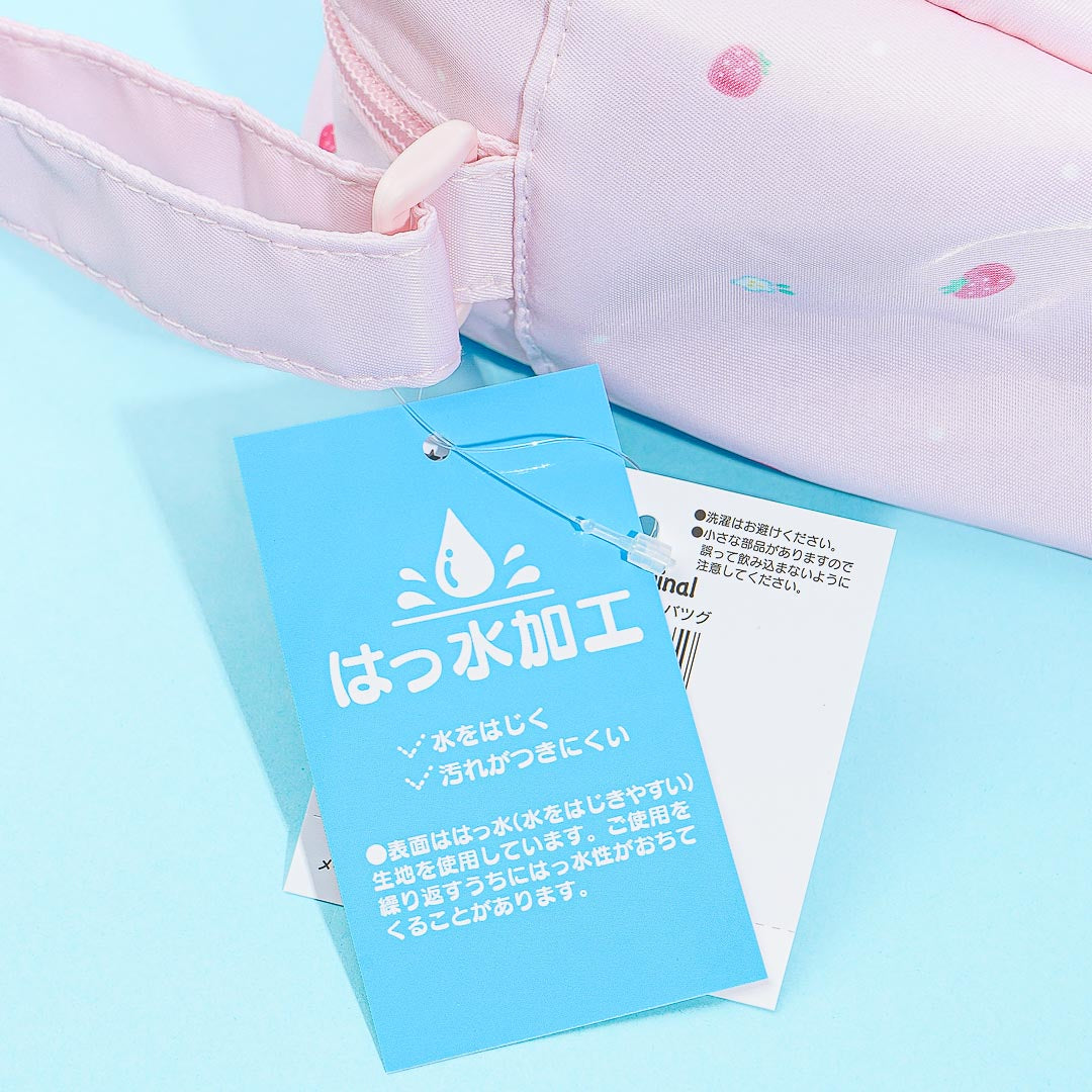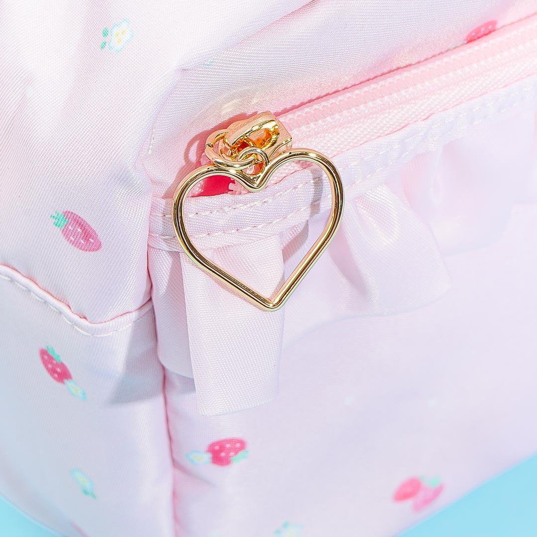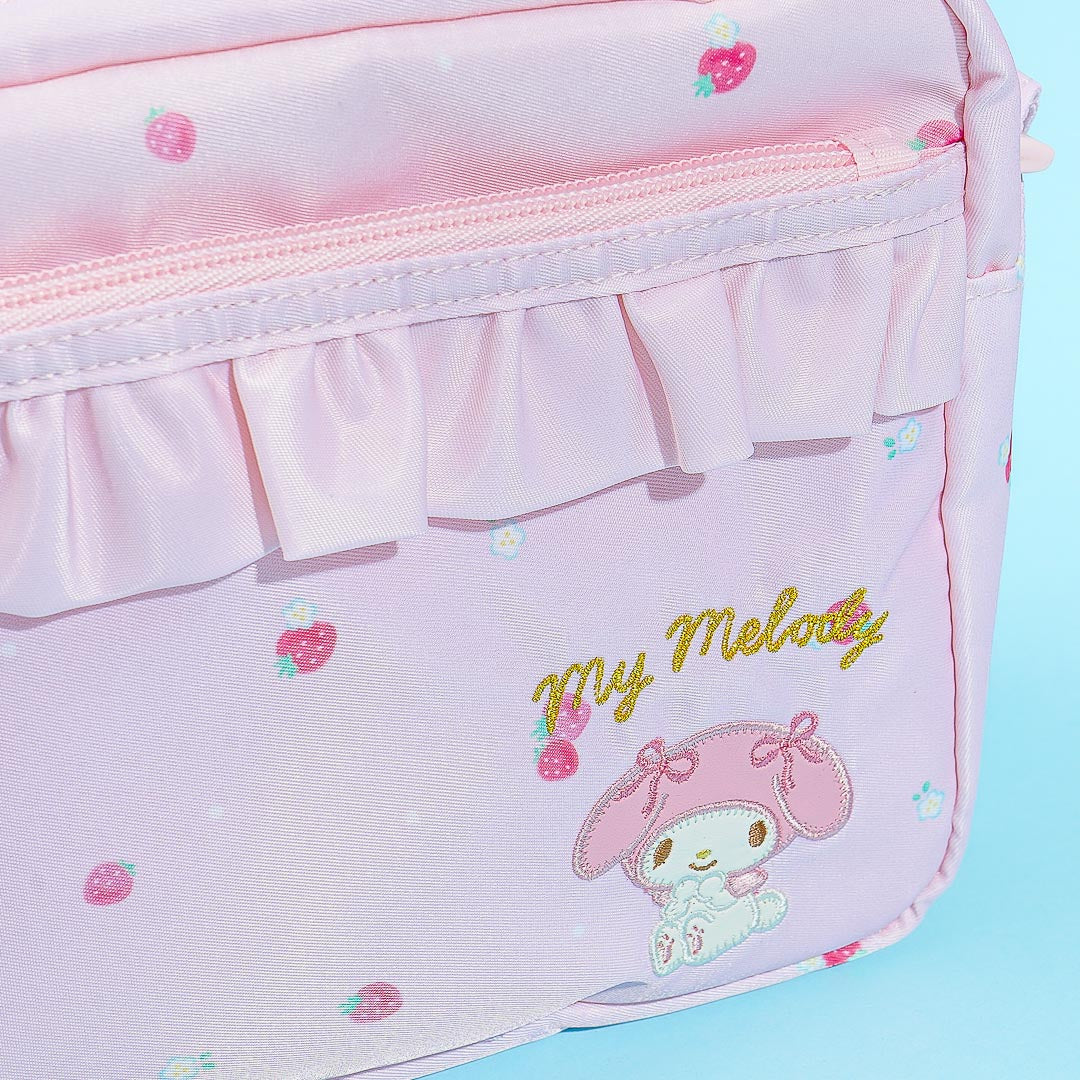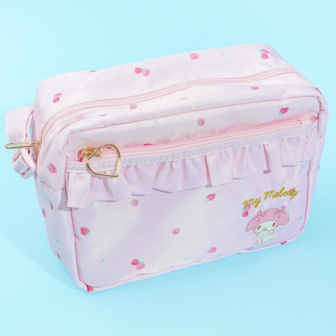 Carry your valuables using this kawaii shoulder bag featuring My Melody and strawberries! It has an adjustable shoulder strap and zipper closure. There's also a small frill-lined outer pocket and a heart-shaped zipper!