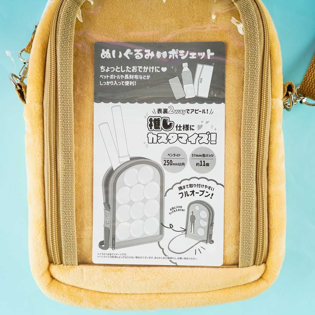 A kawaii plushie shoulder bag illustrated with Pompompurin with pop-up ears and feet