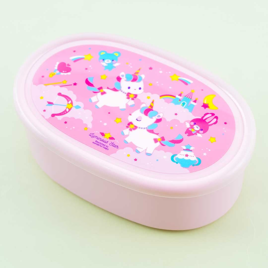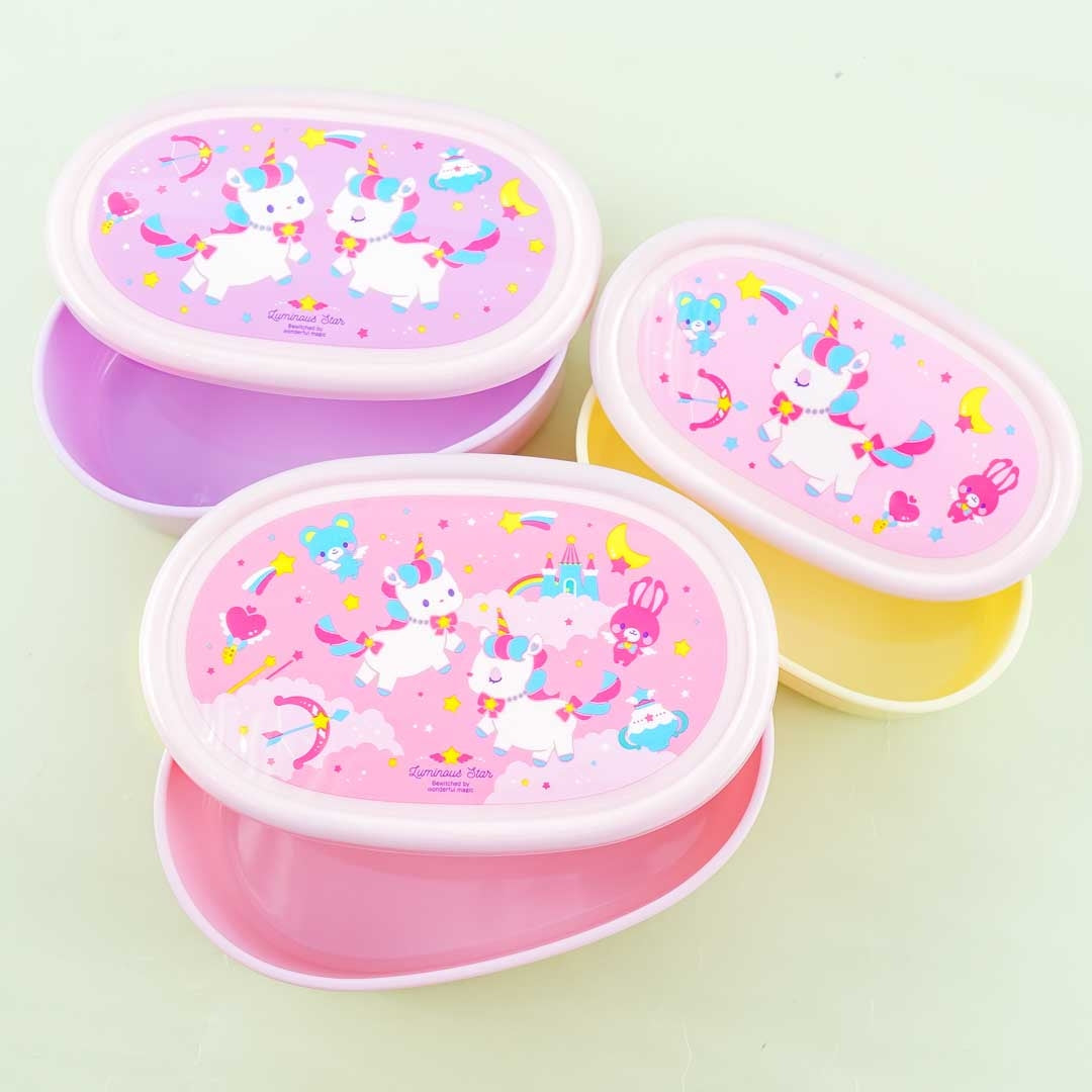 Pack your favorite meals for lunch using this super kawaii set of bento boxes featuring prints of rainbow unicorns! These bento boxes can be stored inside each other like nesting dolls. Each bento box has a different unicorn design. Make sure to remove the lid before microwaving meals in these bento boxes!