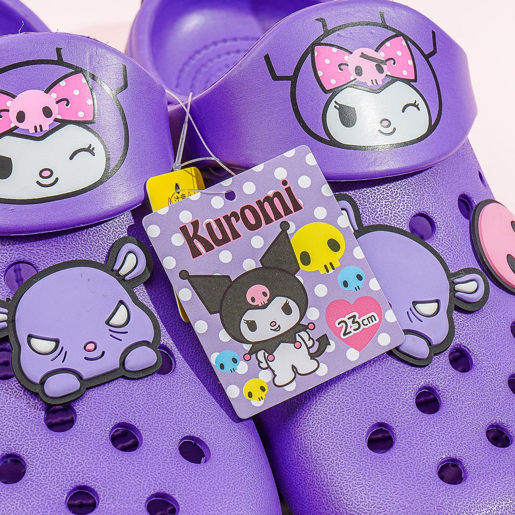 Look super cute even when at home by wearing this kawaii purple pair! These medium-sized sandals are made with EVA — a special rubber-like resin material. Each slipper is decorated with cute illustrations of Kuromi and decked with rubber charms of Baku and pink skulls.