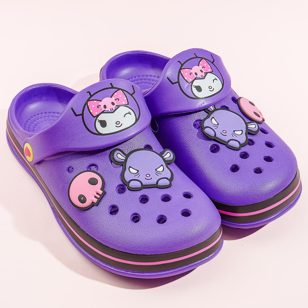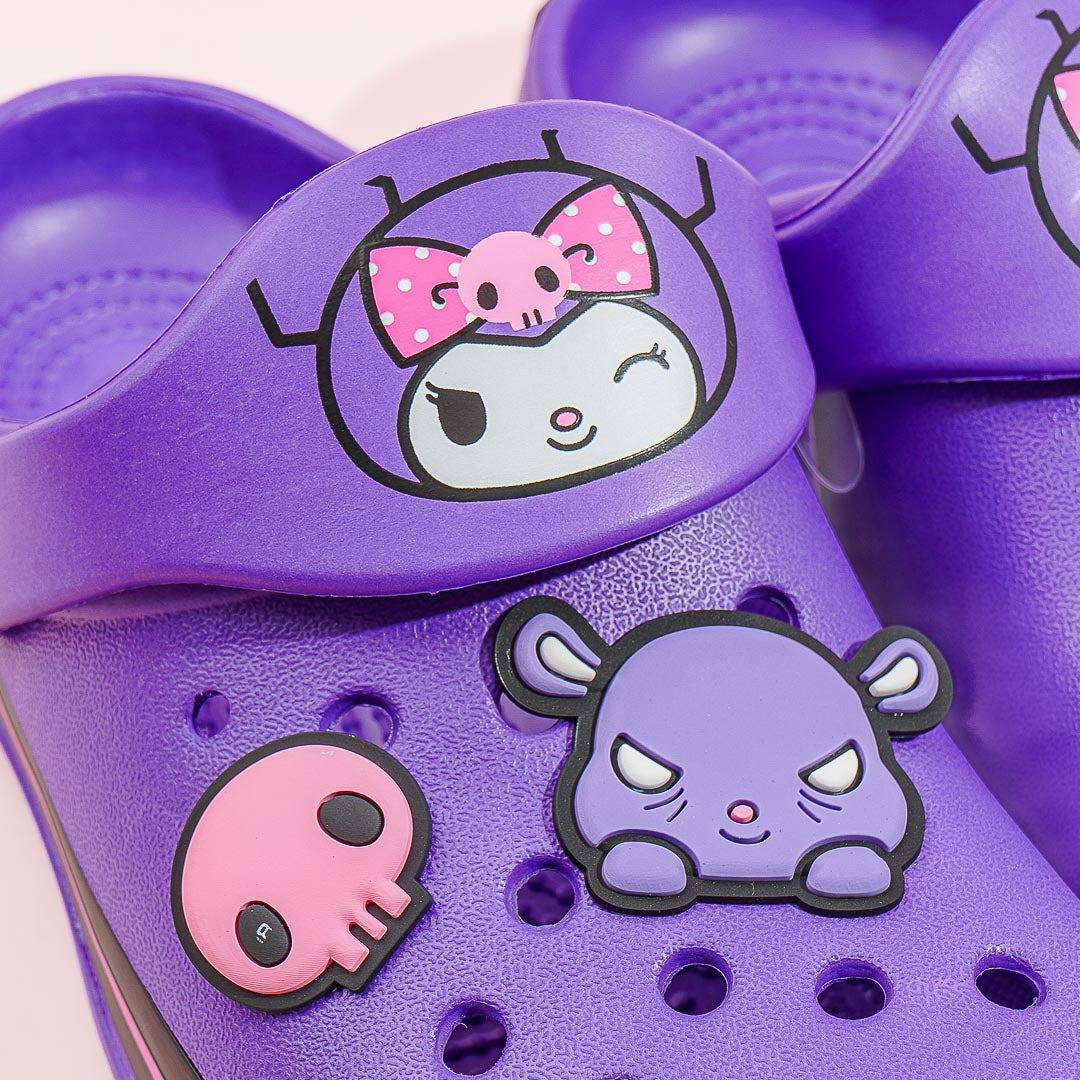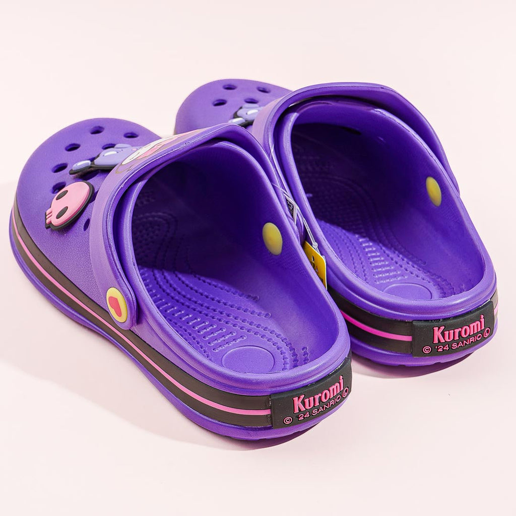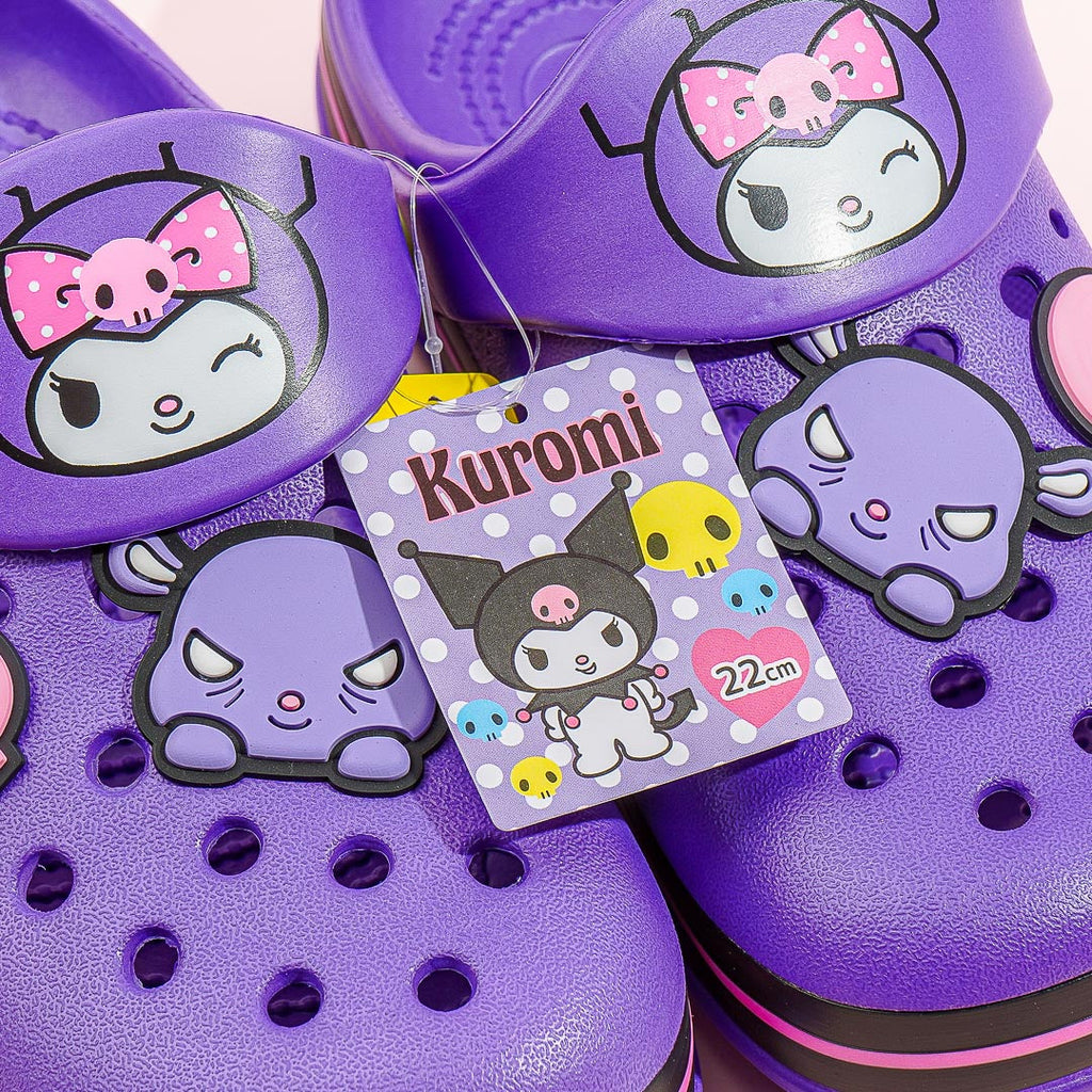 Lounge around your house comfortably by wearing these super cute sandals! The small-sized slippers have kawaii prints of Kuromi and rubber charms of pink skulls and Baku! This purple pair is made with a rubber-like resin material called EVA.