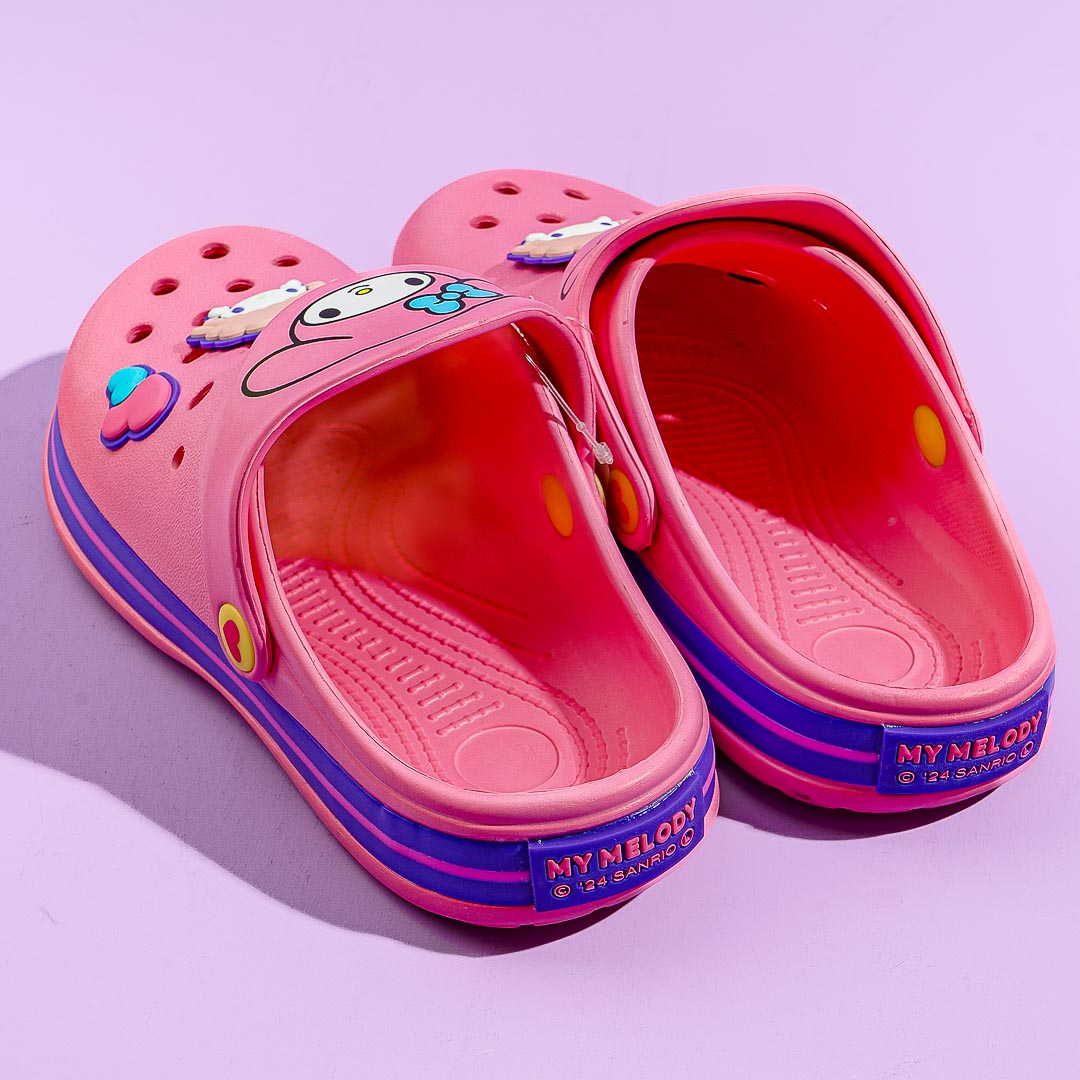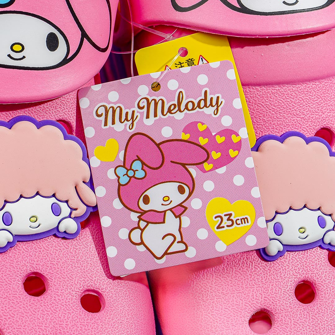 Wear this super cute pair while strolling along the shore! These medium pink slippers have kawaii illustrations of My Melody and rubber charms of My Sweet Piano and hearts! The comfy sandals are made from a rubber-like resin called EVA.