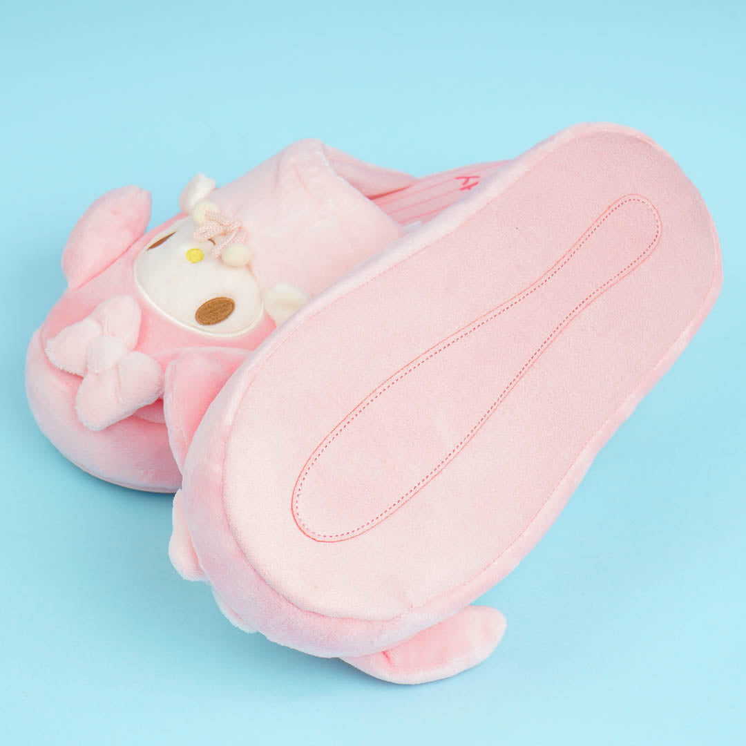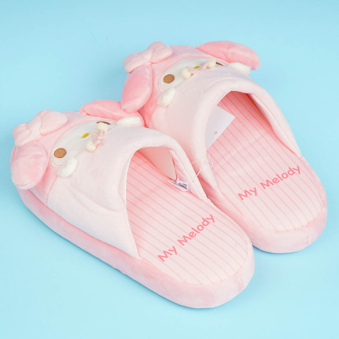 Look comfy and cute even when indoors by wearing this kawaii pair! Each fluffy bedroom slipper has a unique 3D design that looks like My Melody peeking out from her blanket.