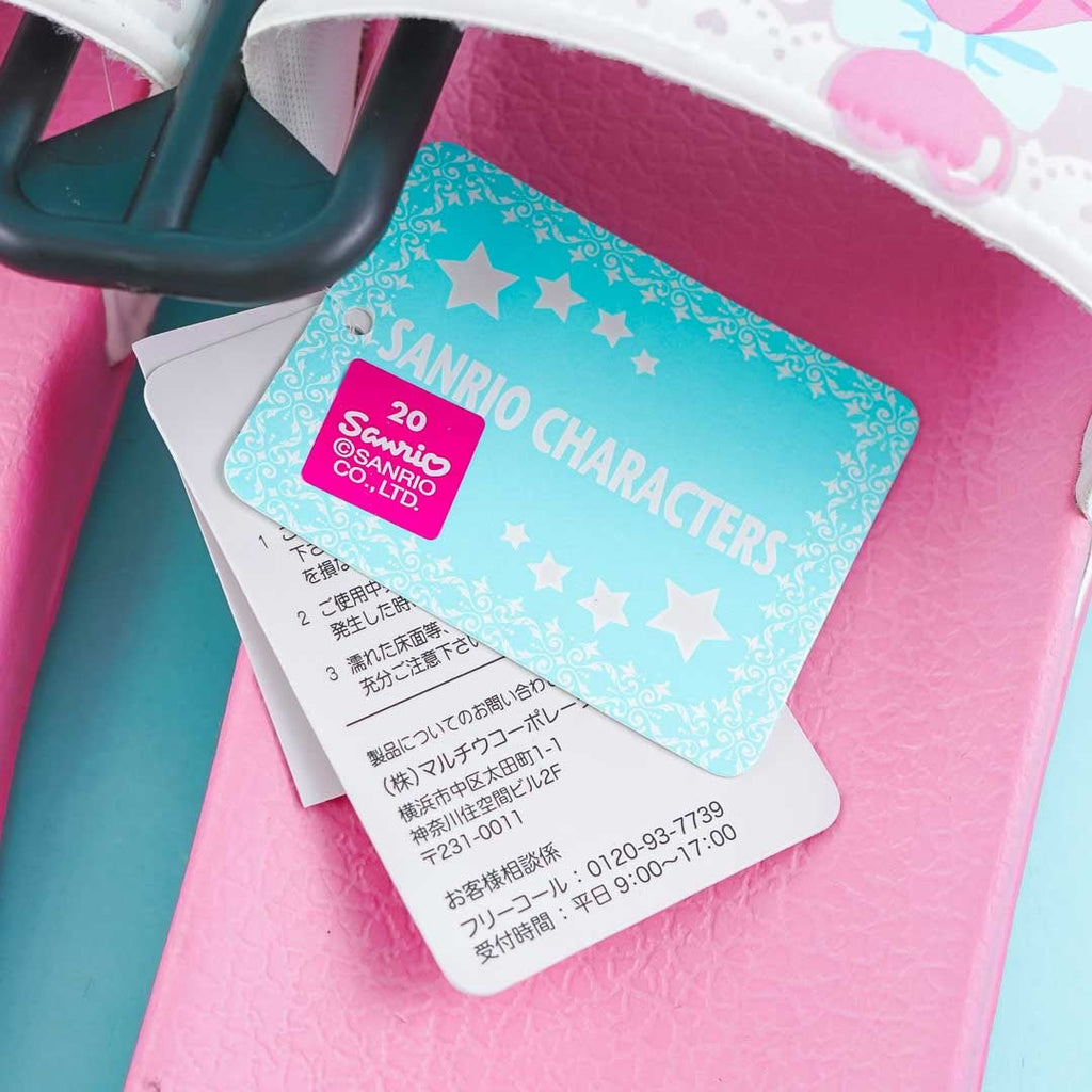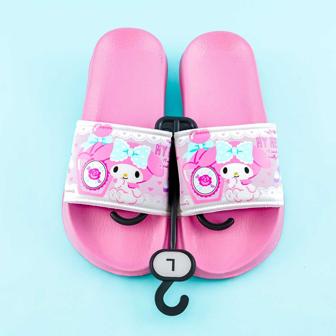 • A kawaii pair of large pink slippers with illustrations of My Melody, lace, and roses