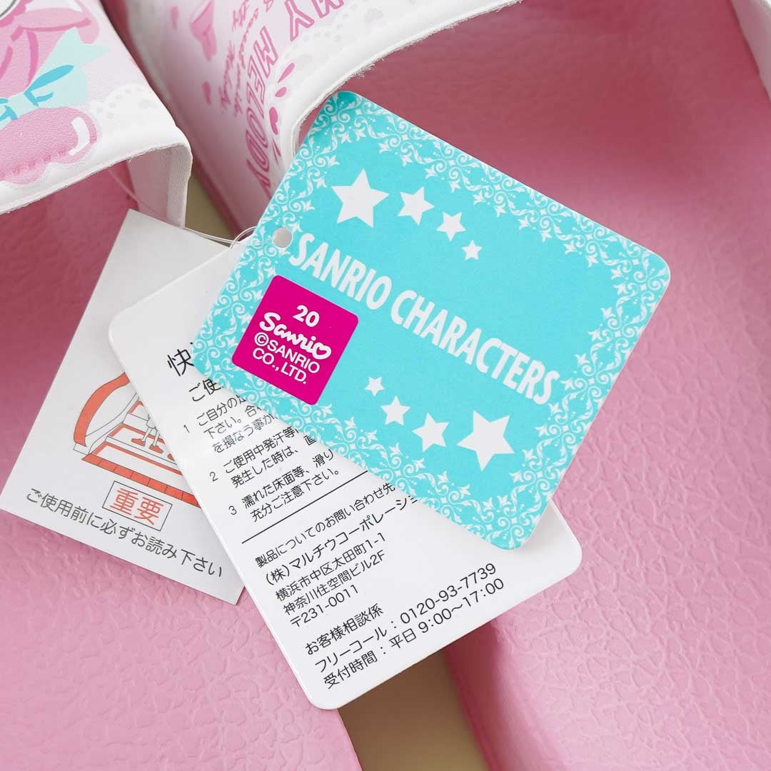 A super kawaii pair of medium pink slippers with illustrations of My Melody, lace, and roses