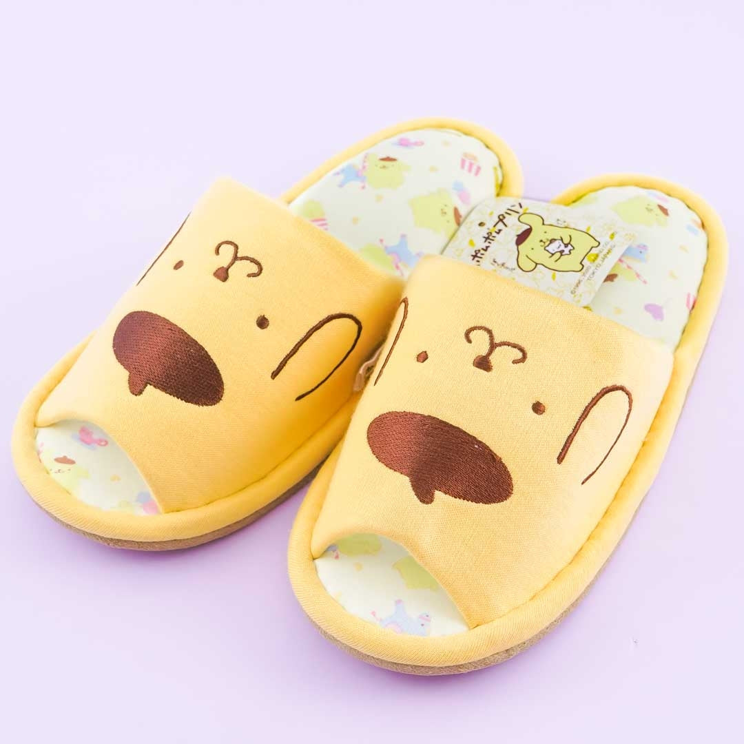 • A cute pair of comfy slippers illustrated with Pompompurin and treats