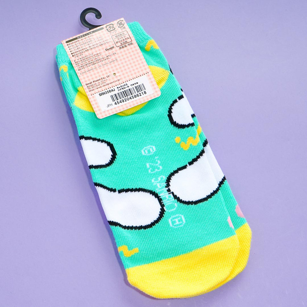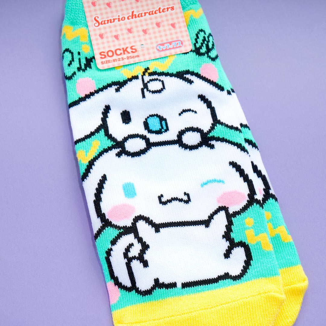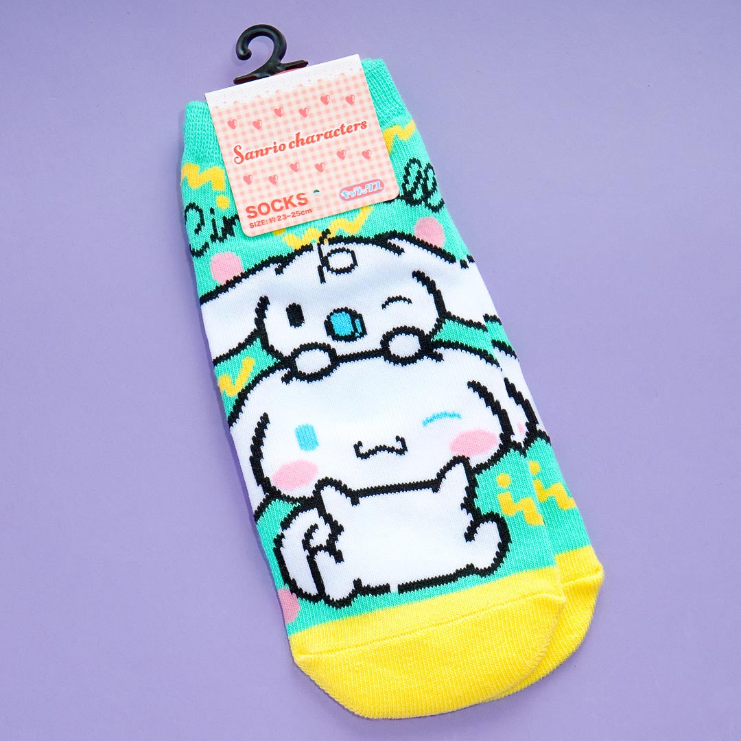 Brighten up your feet with this kawaii pair of ankle-length socks! It has a bright and cool green color with yellow toes and heels. The pair also features a cute Cinnamoroll print!