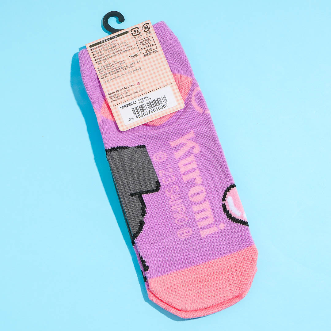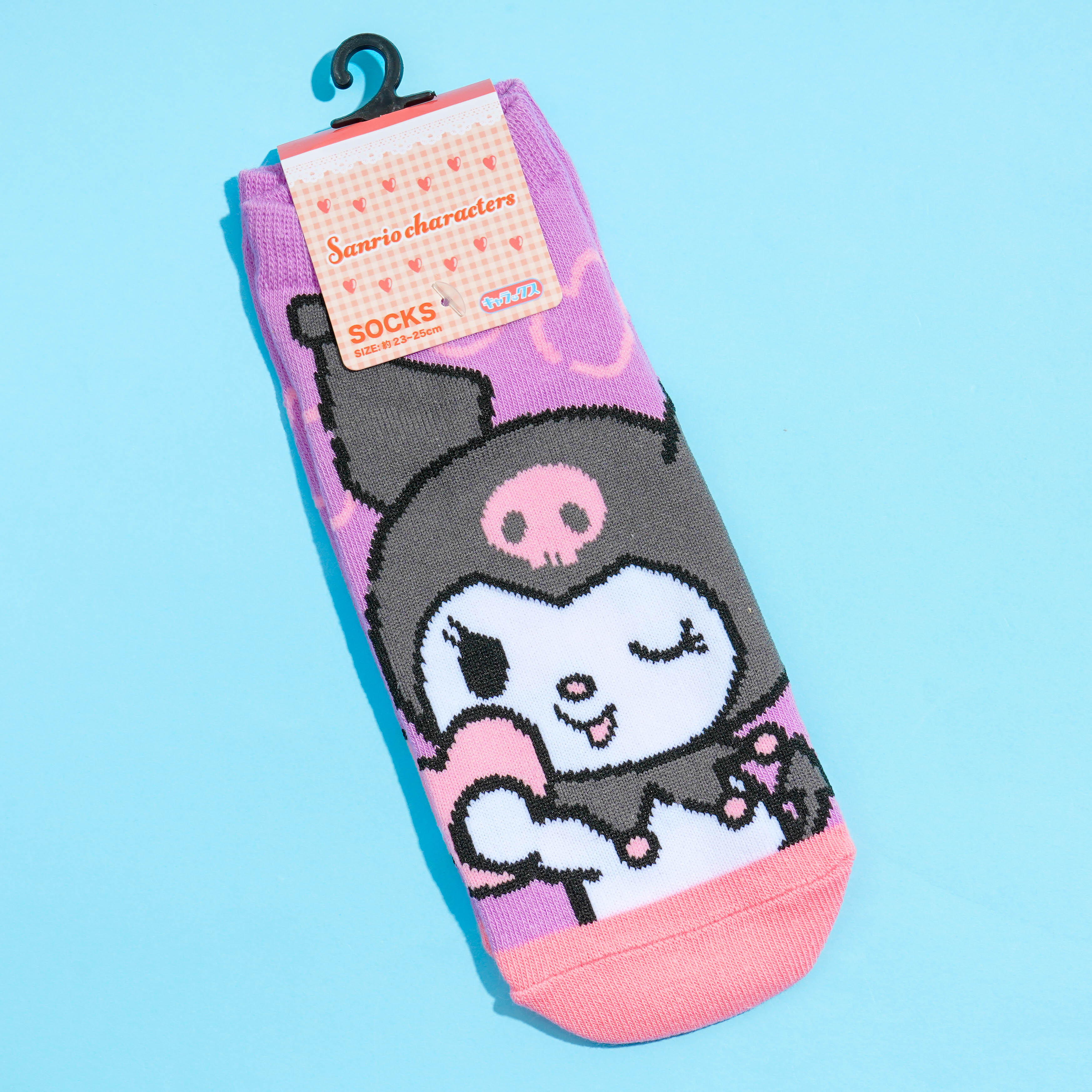 Relax and lounge around at home wearing this pair of comfy socks. They feature prints of Kuromi holding up a heart!