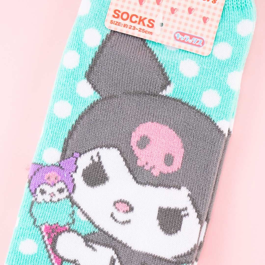 • A kawaii pair of dotted socks illustrated with Kuromi eating ice cream on a cone