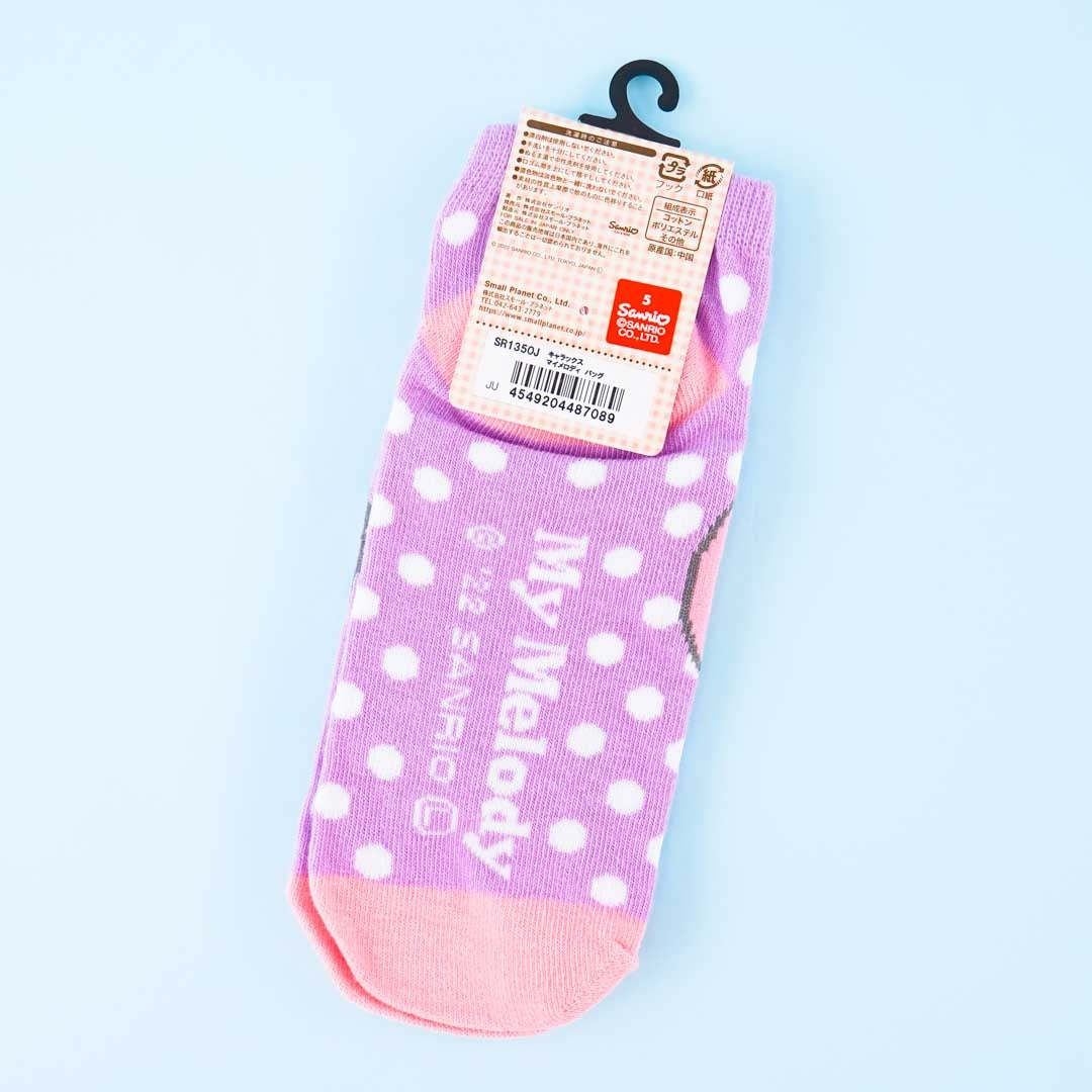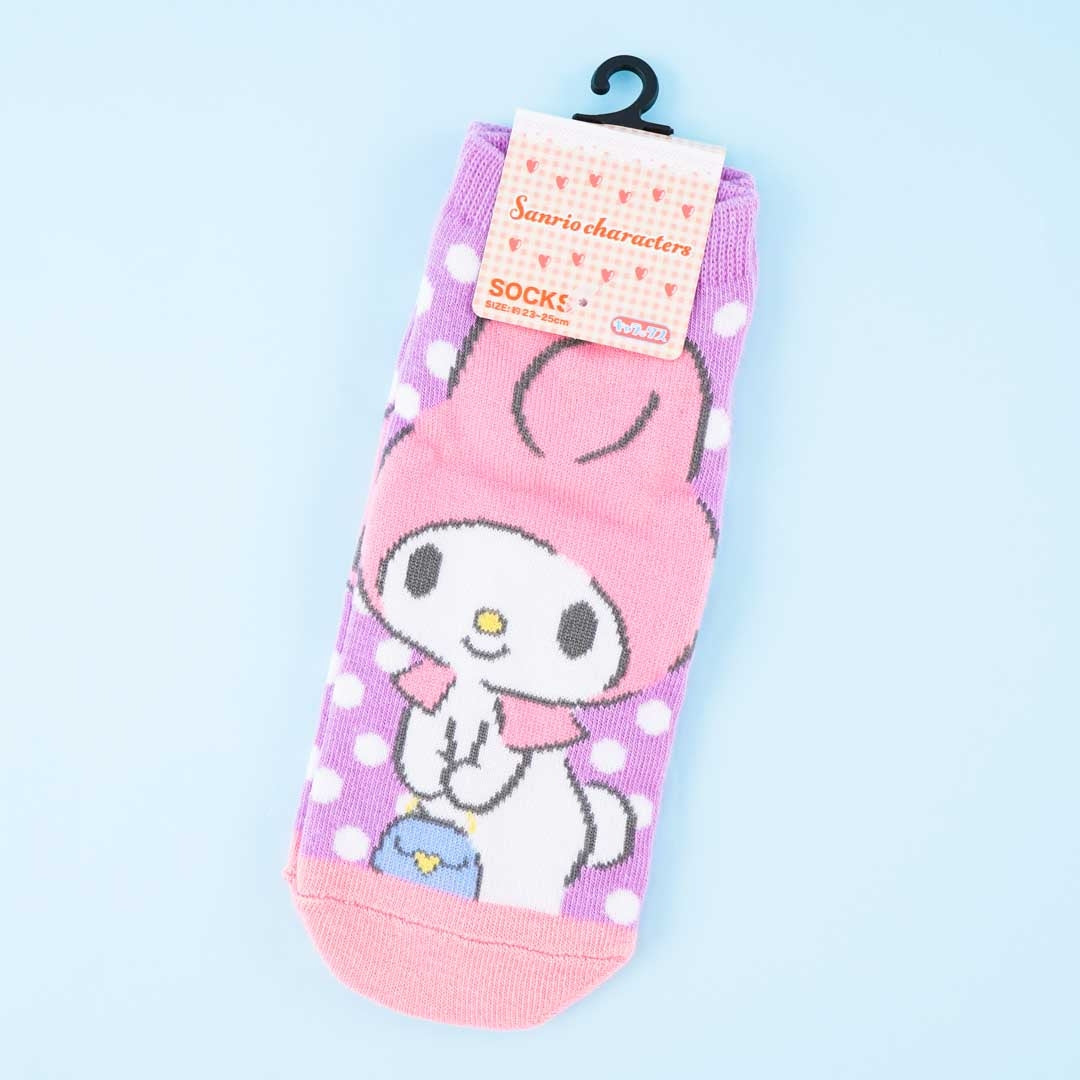 • A cute pair of dotted socks illustrated with My Melody holding a purse