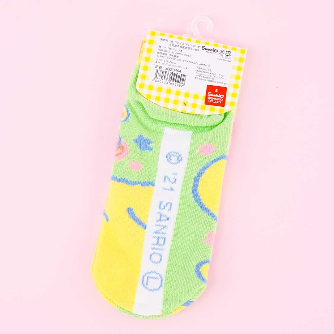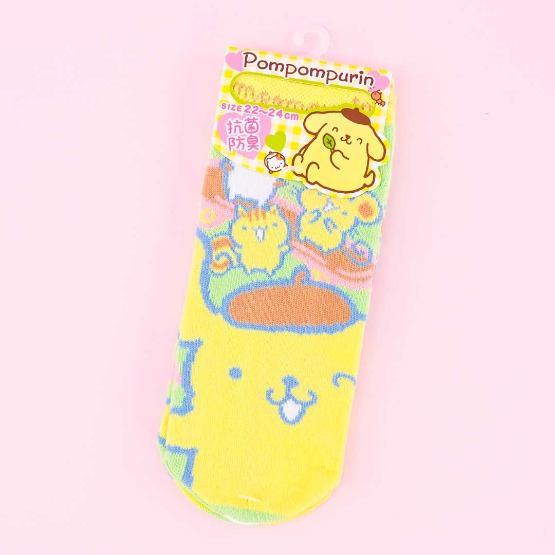 A super kawaii pair of socks showcasing Pompompurin and his friends
