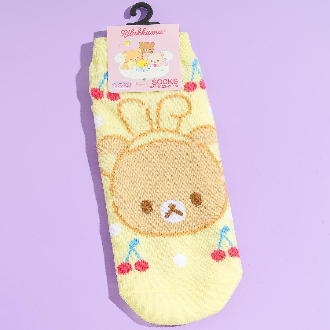 Add a dose of cuteness to your outfit by wearing this kawaii pair of socks. It features prints of Rilakkuma wearing a bunny headband while being surrounded by cherries! These socks come from the Rilakkuma Rabbit Baby series.
