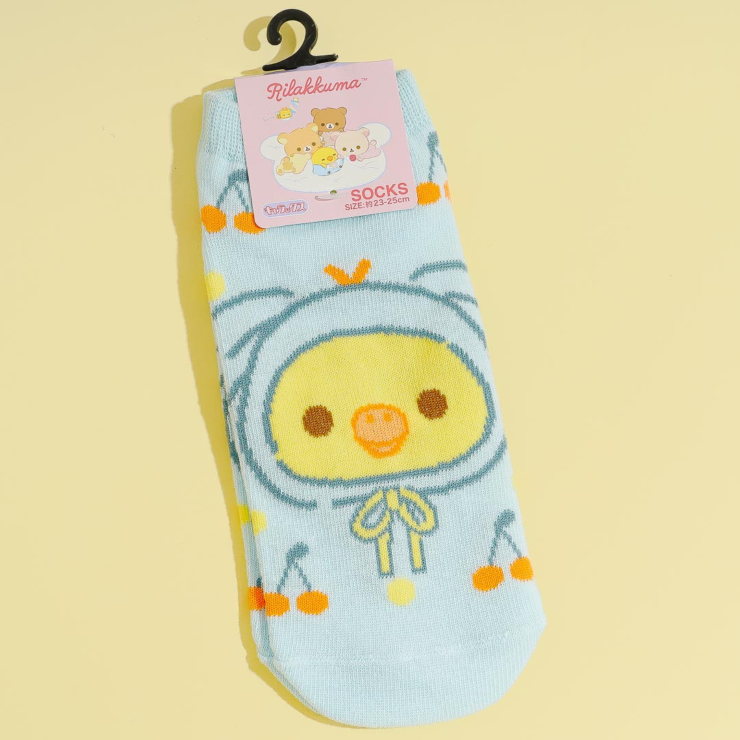 Don't forget to wear this cute pair of socks before putting on your shoes! These socks showcase Kiiroitori, the friend of Rilakkuma, putting on a hoodie with orange cherries. It comes from the Rilakkuma Rabbit Baby series.