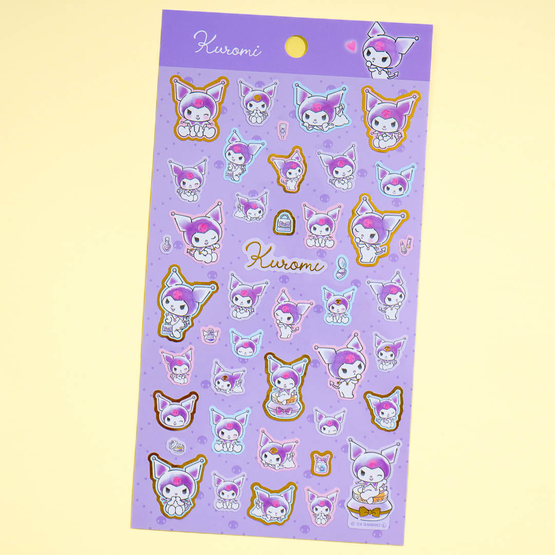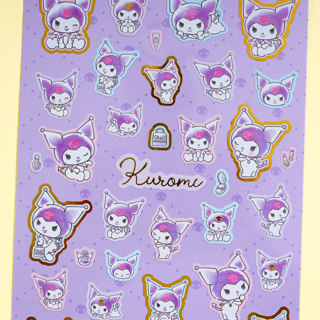 This super kawaii sheet of stickers showcases Kuromi making all sorts of cheeky poses. Use it to decorate your favorite journal or planner! Some of the stickers feature lovely golden accents.