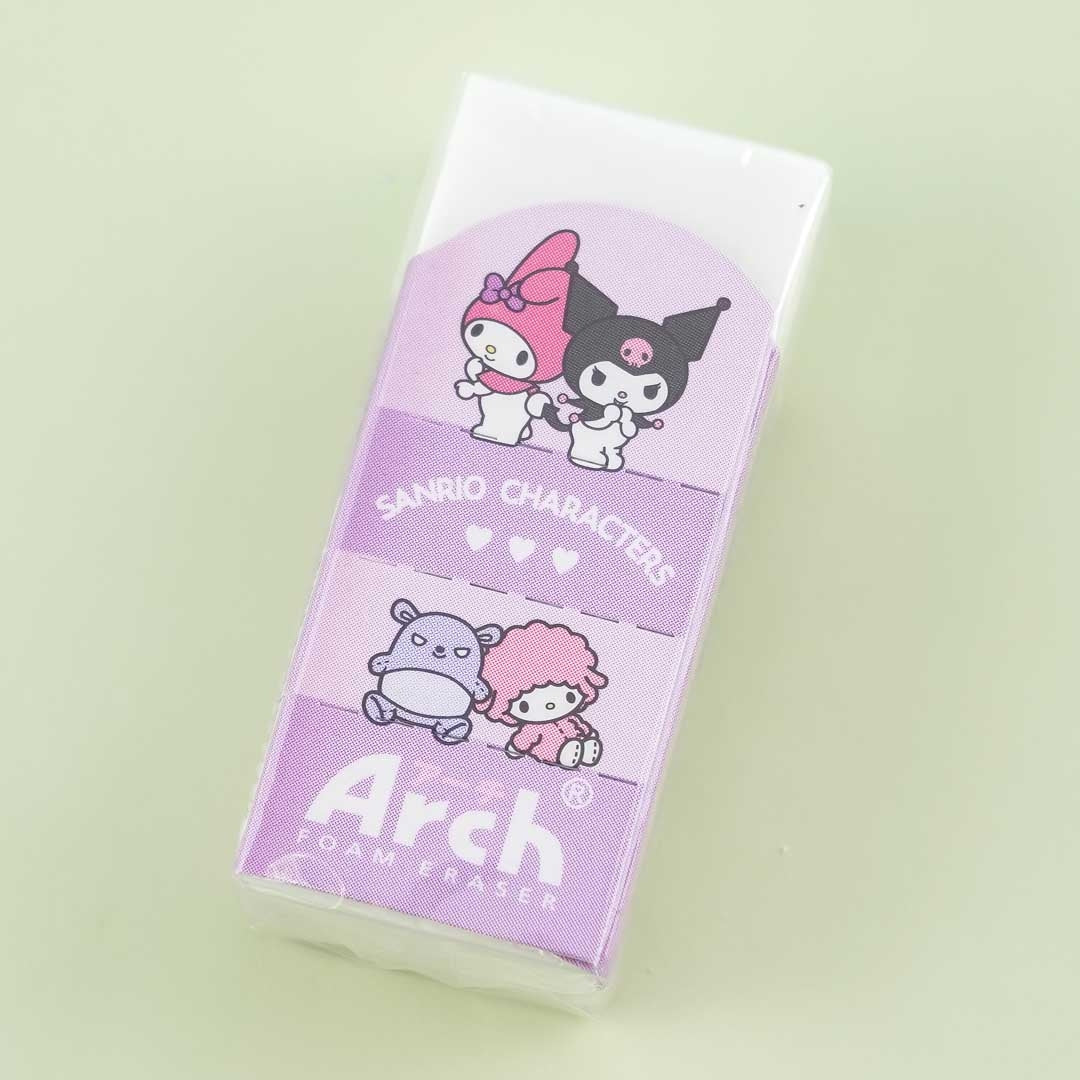 A super cute plastic foam eraser that has an arched cardboard case featuring Kuromi and My Melody