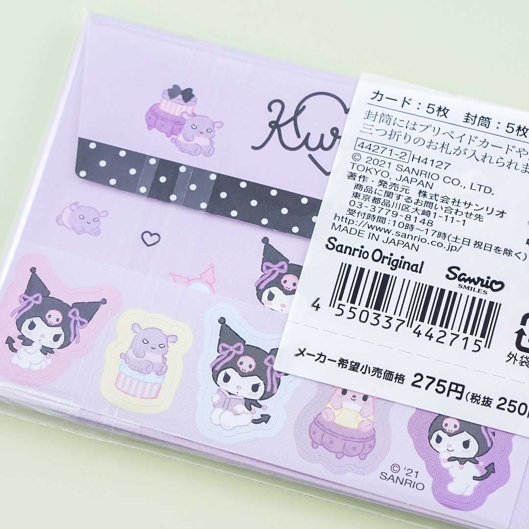 Have fun writing handwritten “thank you” cards using this cute set! It features illustrations of Kuromi, Baku, and their other friends having fun on stage! The set includes five printed message cards with five matching envelopes — plus a sheet of die-cut stickers.