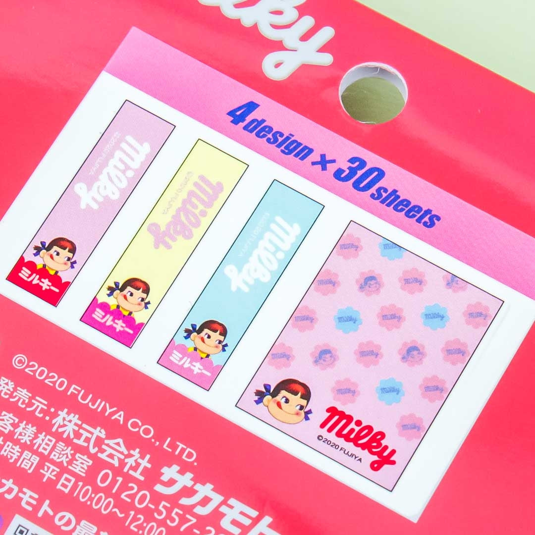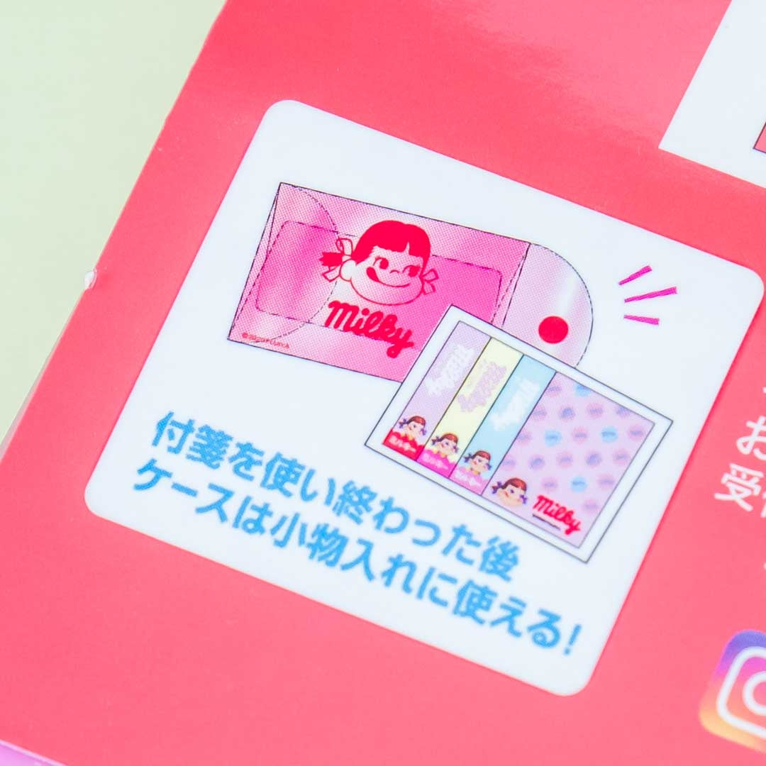 Write down important reminders on this cute set of sticky notes featuring prints of Milky candy's mascot, Peko-chan! This set has four designs for you to use. It comes in a plastic case with a button closure.