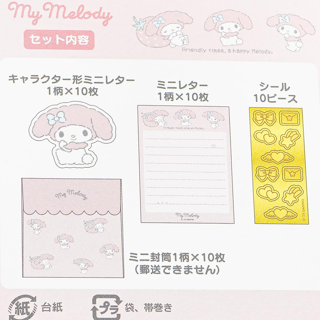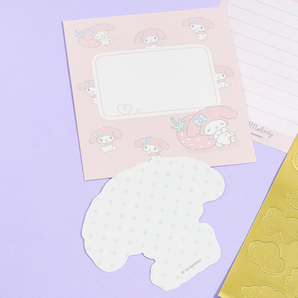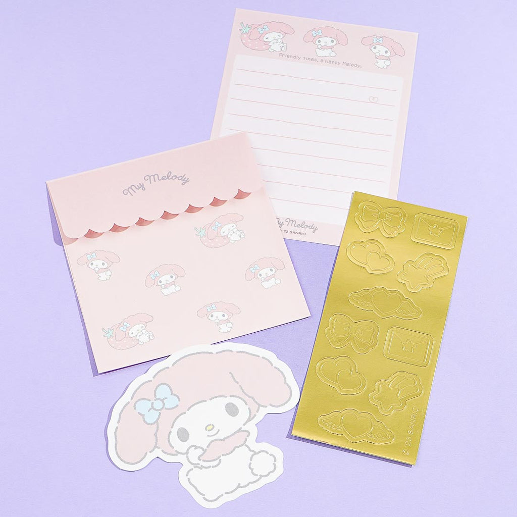 Includes: 10 x My Melody die-cut sheets, 10 x square sheets, 10 x mini envelopes, and 1 x gold sticker sheet