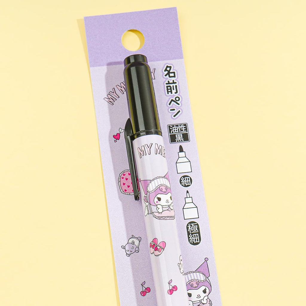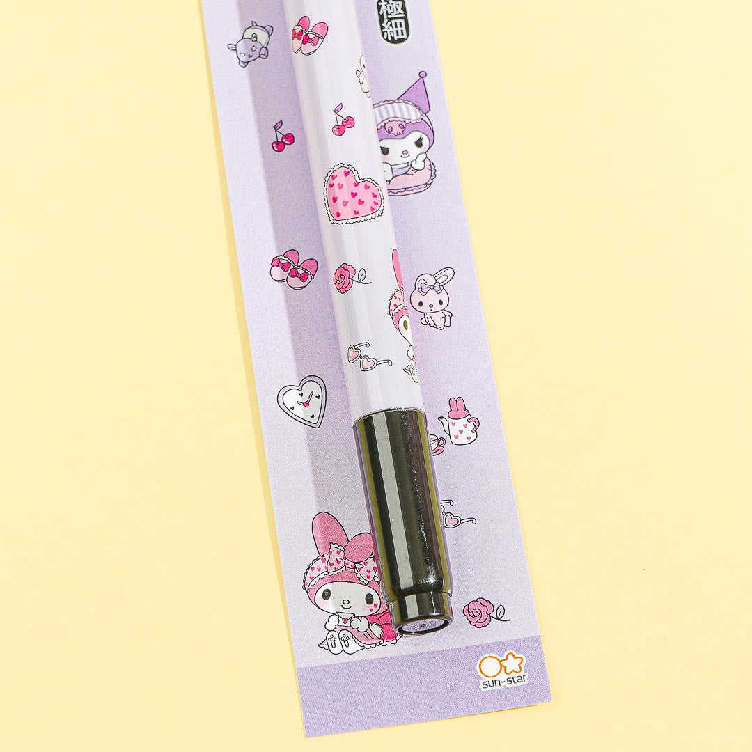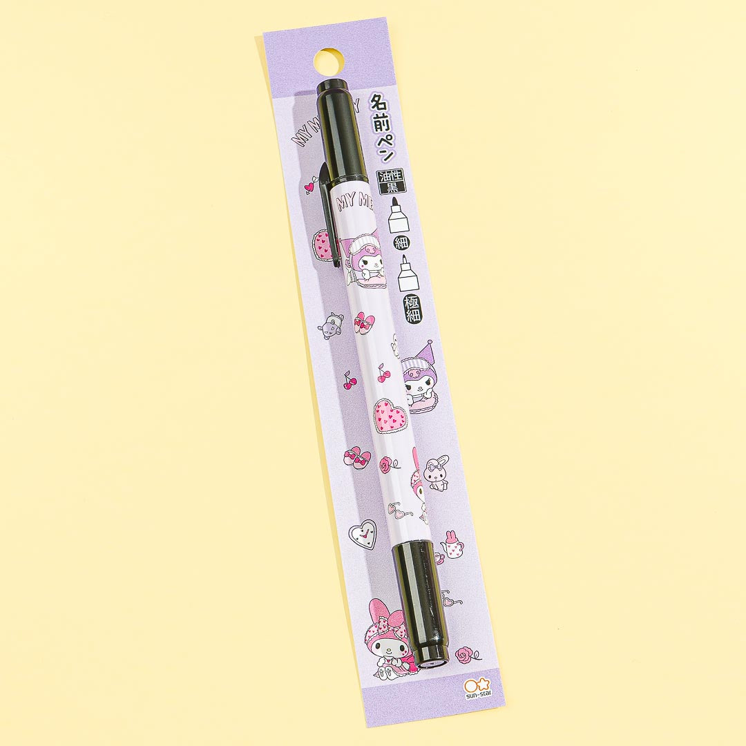 Have fun practicing your calligraphy with this cute felt-tip pen. It's covered in prints of My Melody having a slumber party with her friends Kuromi and My Sweet Piano! Not only does it write well on paper but it also does great on cloth products like handkerchiefs and pants.