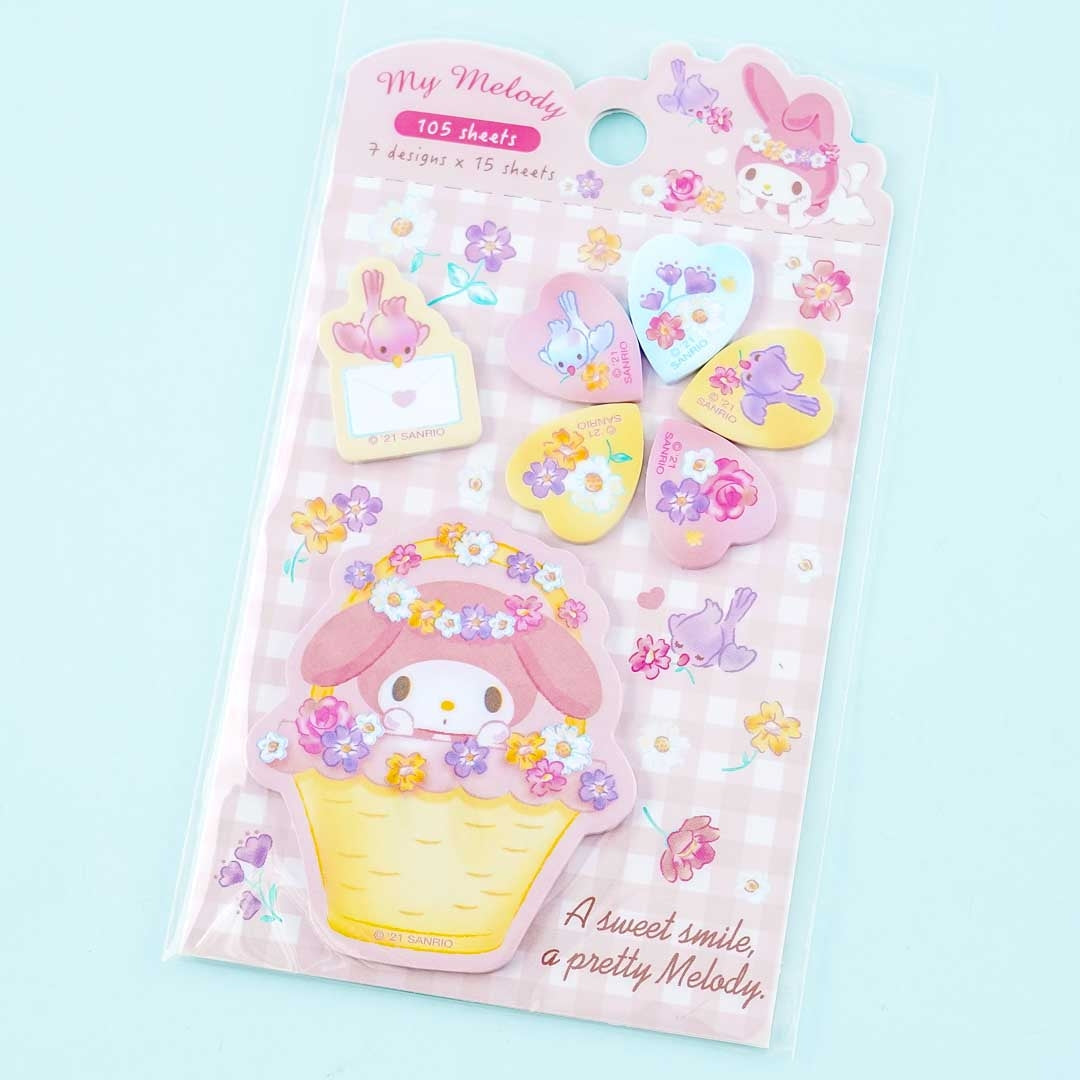 A super cute set of die-cut sticky note tabs with prints of My Melody with spring flowers