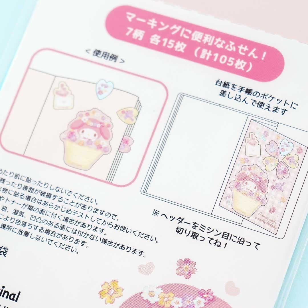 Use these kawaii sticky tabs on your books so you can mark important pages! The pack comes with seven die-cut designs featuring My Melody playing with lots of springtime blooms.